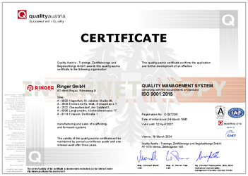 Since 1996, RINGER has relied on a certified quality management system in accordance with ISO 9001:2015. This milestone is a central part of our success story and has supported our continuous growth since 1998. We will soon be proudly celebrating the 30th anniversary of this quality certification.