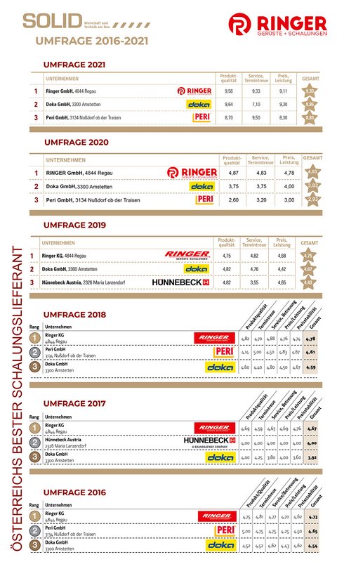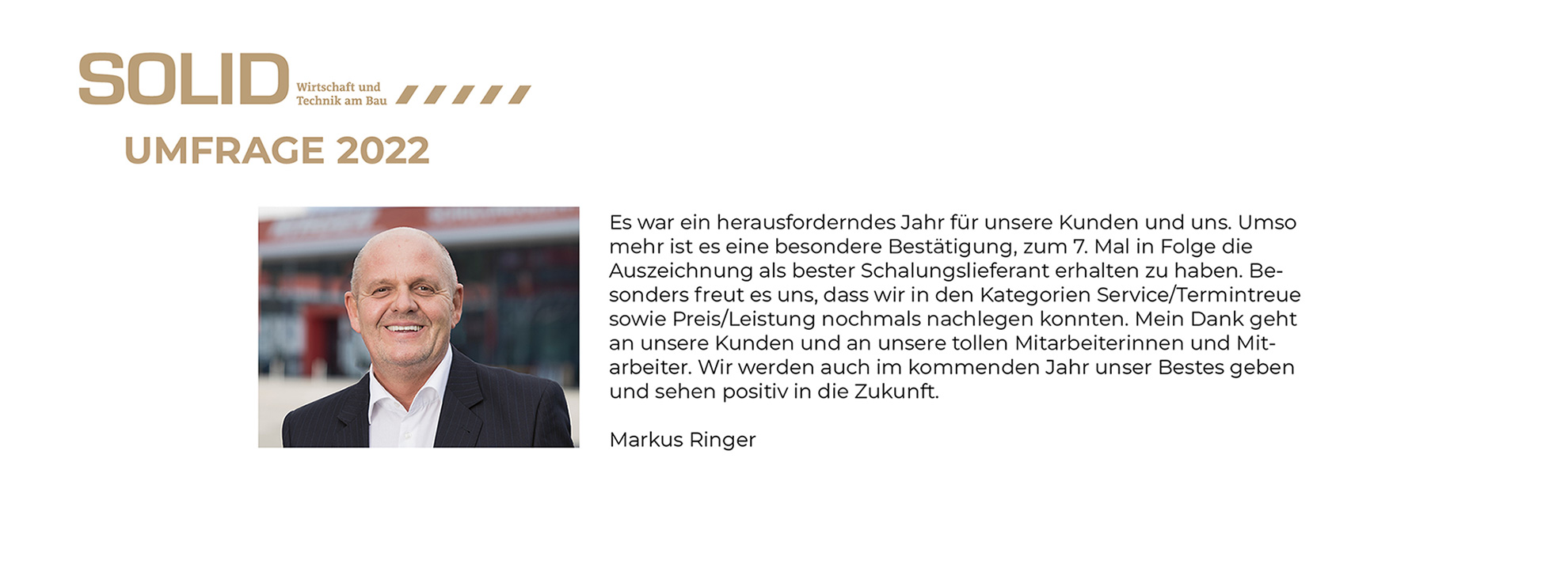 Sieben auf einen Streich. So könnte man das Ergebnis des diesjährigen Lieferantenrankings der österreichischen Fachzeitschrift SOLID bezeichnen. Bereits zum 7. Mal in Folge konnte RINGER das prestigeträchtige Ranking für sich entscheiden. In einer umfassenden Umfrage konnten die Kunden die Partner am Markt unabhängig bewerten. Zur Auswahl standen die Kategorien „Preis/Leistung“, Service/Termintreue sowie Produktqualität. Unterm Strich erreichte RINGER erneut den ersten Platz in der Kategorie „Schalung“ und konnte somit den Titel „Bester Schalungslieferant Österreichs“ auch 2022 erfolgreich für sich entscheiden.