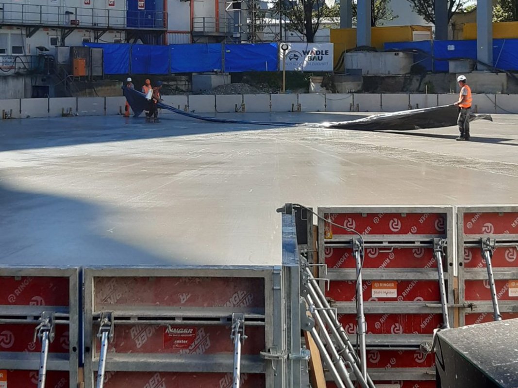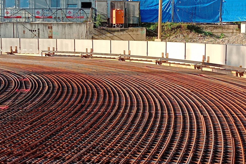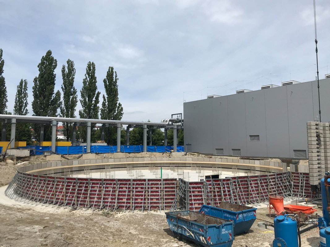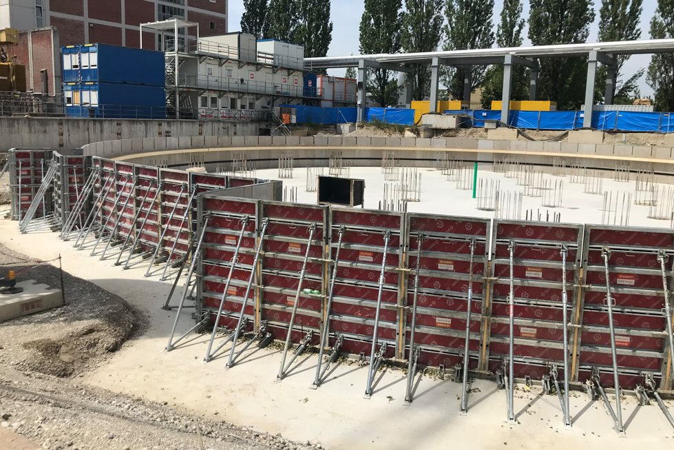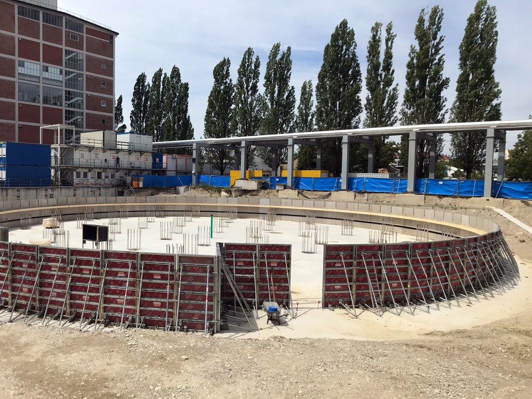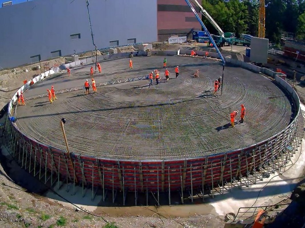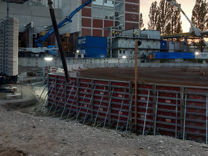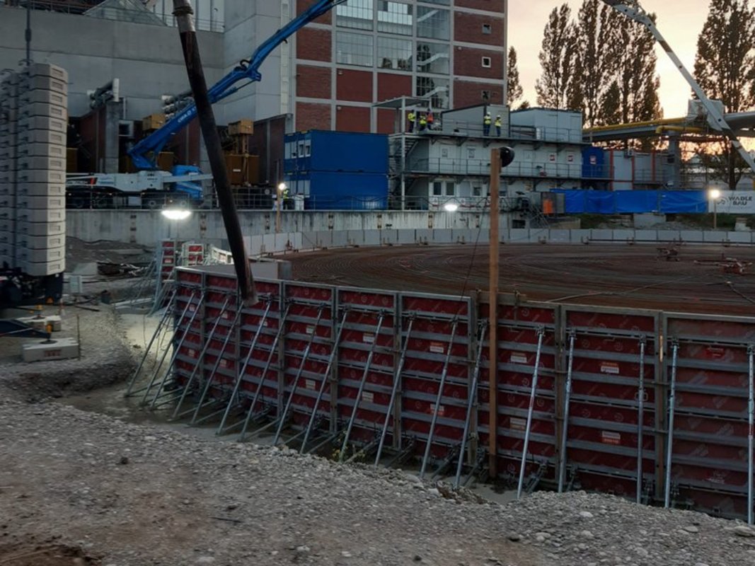 Das runde Fundament des Wärmespeichers erstreckt sich über eine Fläche von 1.288m² und weist im Zentrum eine Betonhöhe von 2m auf. Von der Mitte bis zur Außenseite mit einer Höhe von 1,80m wurde ein 1-prozentiges Gefälle vorgesehen. Um aufgrund der enormen Maße dem Betondruck standzuhalten, war ein robustes Schalungssystem gefordert. Die Wadle Bauunternehmung GmbH entschied sich im Zuge der Planung für die leistungsfähige Stahlrahmenschalung Stahl Master von RINGER. Das System bietet die optimalen Voraussetzungen für großflächiges Schalen mit dem Kran und bewältigt zudem bis zu 80 kN/m² Betondruck. Durch den Einsatz von Master Bogenblechen und Uni-Schienen können Rundungen problemlos realisiert werden. In diesem konkreten Fall wurde die Rundung mit eingelegten Kanthölzern und Master Klemmen verstellbar umgesetzt.