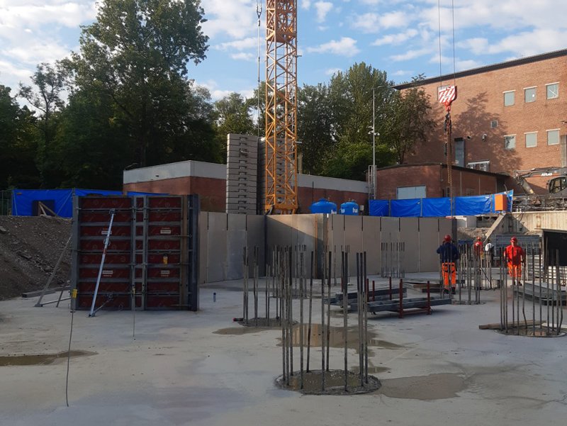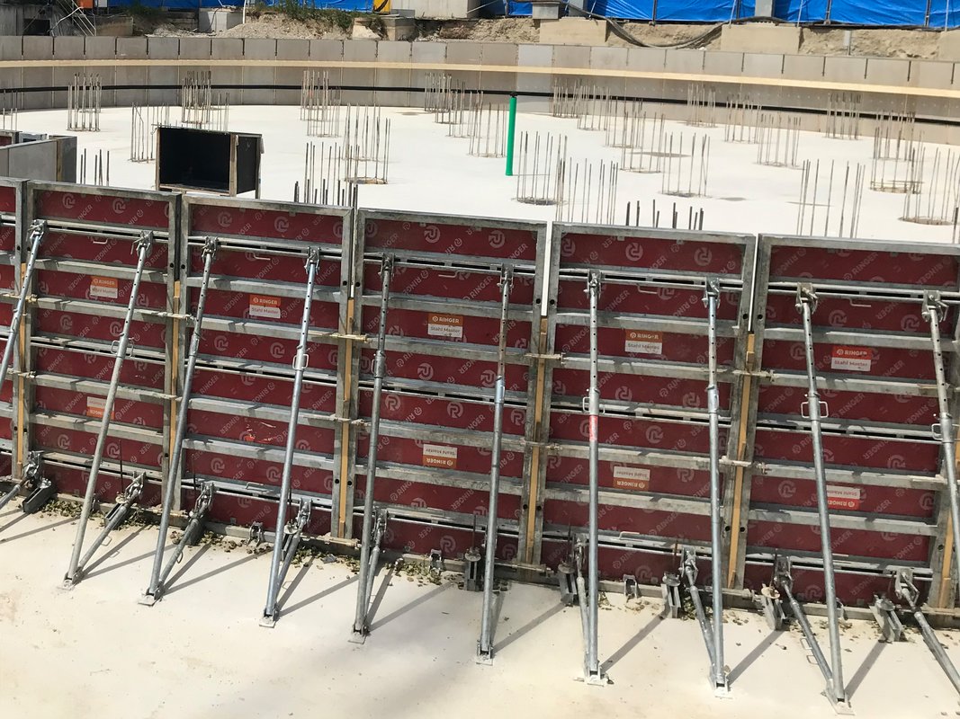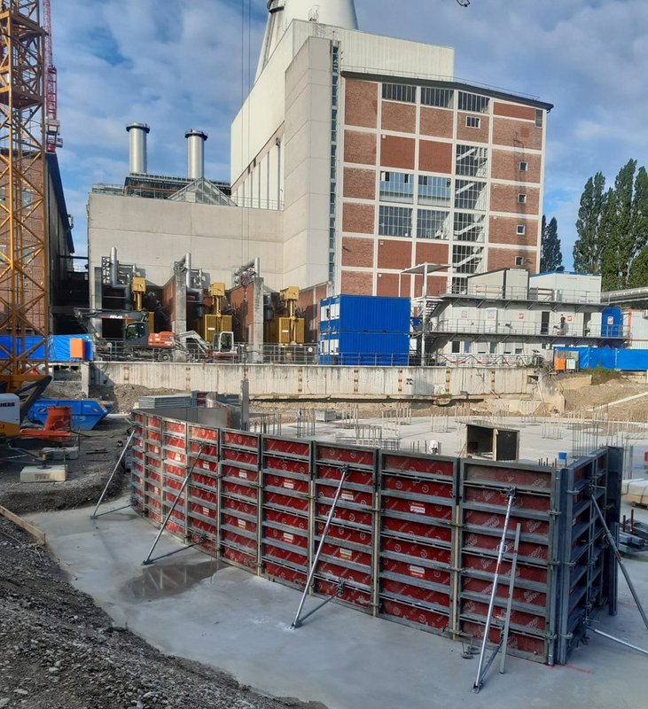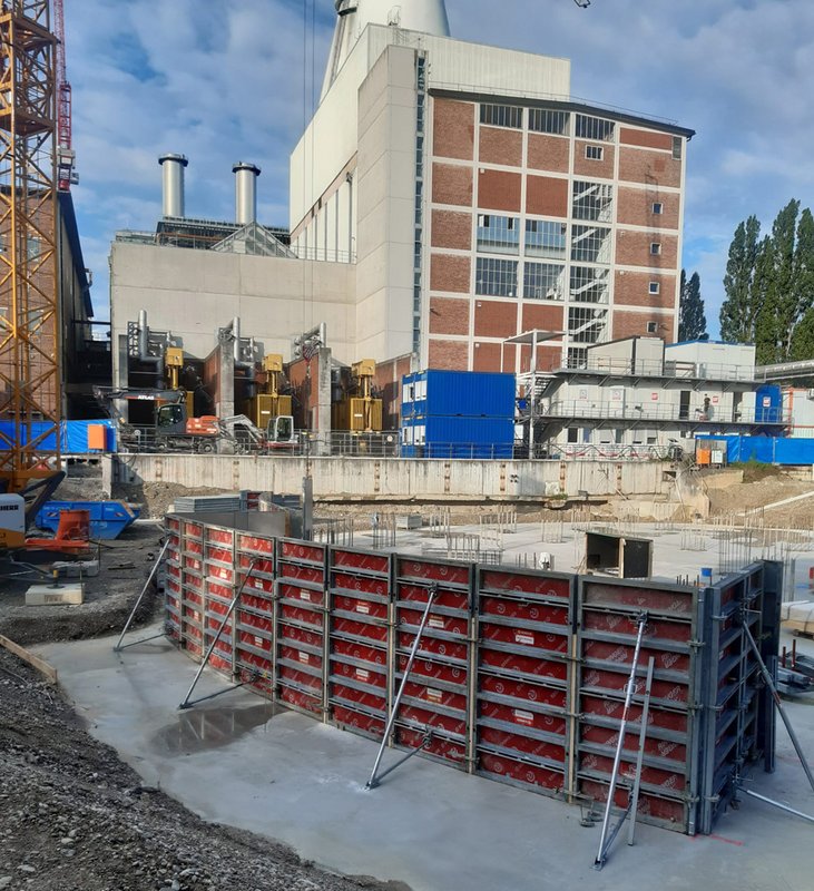 Insgesamt waren 87 Hauptelemente Stahl Master (135 x 270cm) sowie eine Kombination aus weiteren, kleineren Elementen verschiedener Breiten (30cm, 50cm, 60cm, und 90cm) nötig, um die gesamte Fundamentschalung in einem einzigen Betonierabschnitt zu realisieren. Alles in Allem wurden dabei knapp 326m² Schalelementfläche Stahl Master eingeplant. Zum reibungslosen Einrichten der Stahlrahmenschalung kamen RINGER Richtstützen GR1 zum Einsatz.