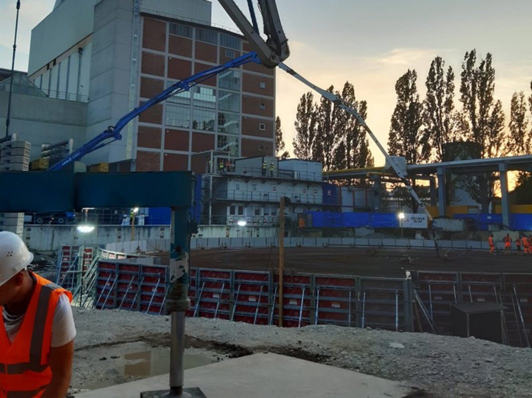 Die beeindruckende Bewehrung für das Fundament belief sich auf stolze 400 Tonnen Baustahl. Zwei Betonpumpen waren im Einsatz, um die weitläufige Baugrube zu füllen. Insgesamt wurden 350 Lkw-Ladungen Beton in einem akribisch getakteten Drei-Minuten-Takt eingebracht, wobei der gesamte Betoniervorgang in 18 Stunden abgeschlossen wurde.