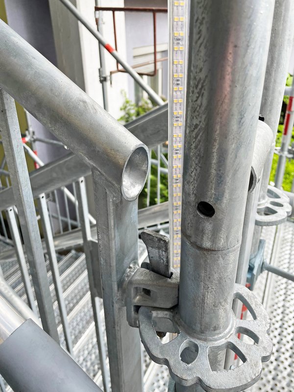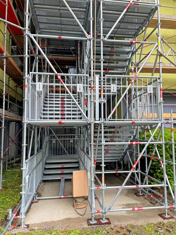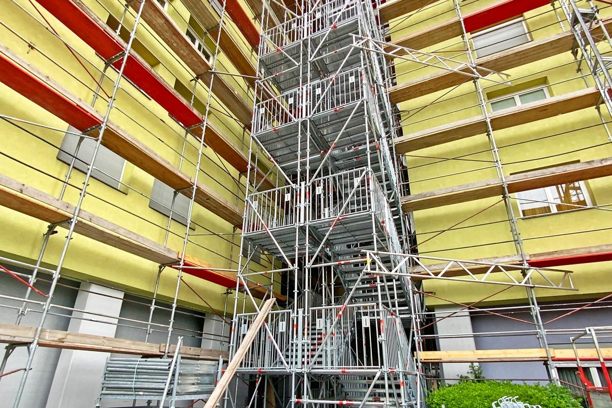 Als Lösung wählte das Gerüstbauunternehmen Roman Mair & Söhne GmbH einen 42 m hohen Treppenturm Public von RINGER. Dieser diente als provisorisches Stiegenhaus und entsprach dabei den geforderten Sicherheits- und Komfortansprüchen. Der Treppenturm Public erfüllt alle notwendigen Vorschriften, einschließlich der für öffentliche Bereiche geltenden Normen wie der ÖNORM B5371 und der OIB-Richtlinie 4.