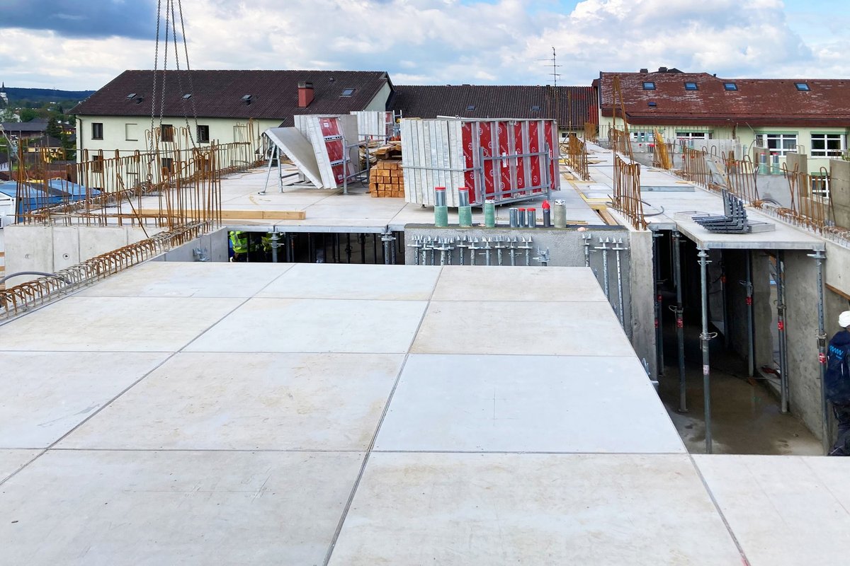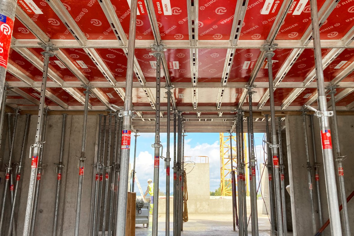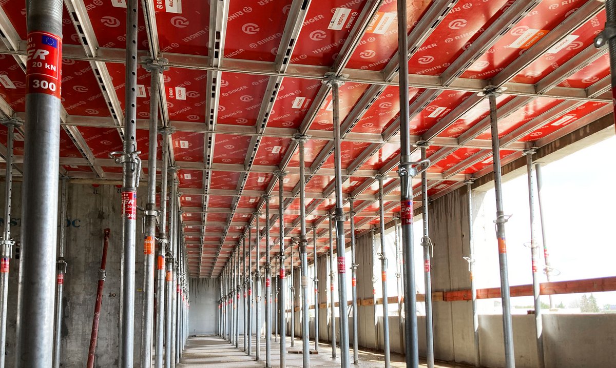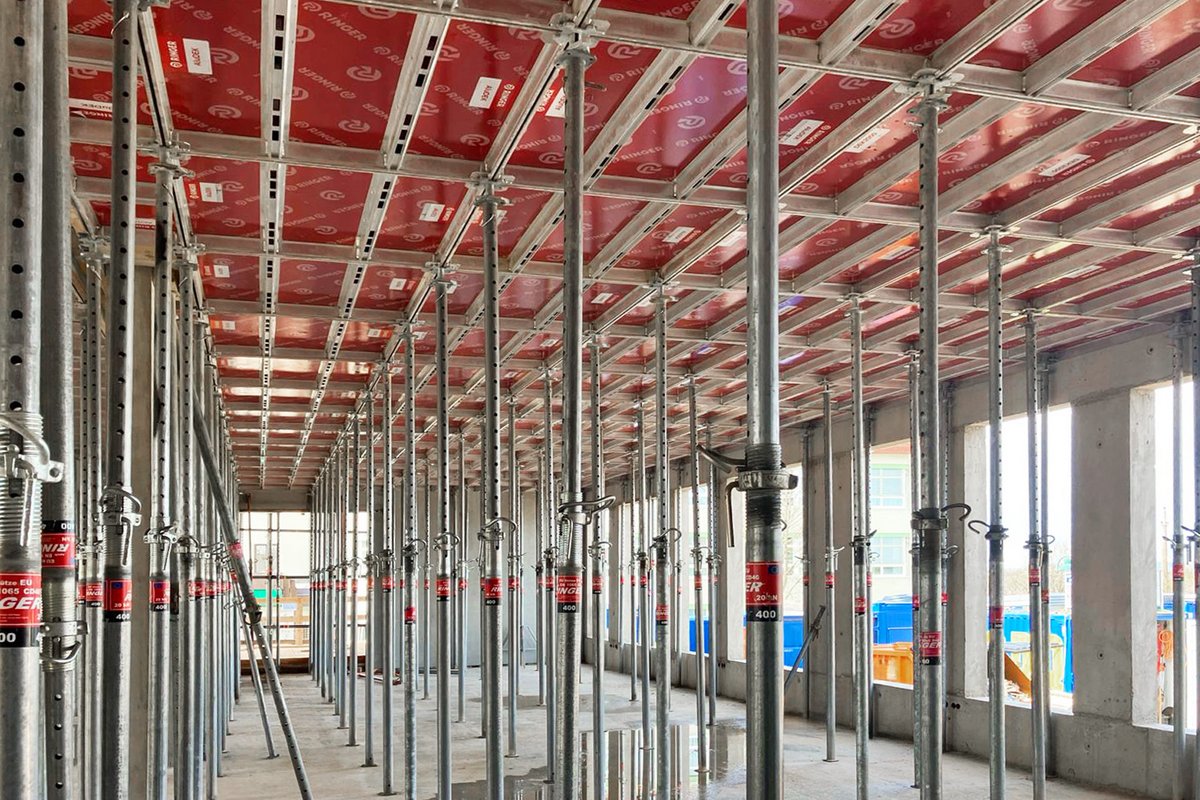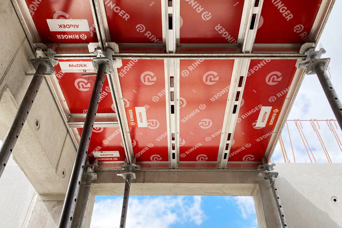 Zum Schalen der Decken kam das schnelle AluDEK-System von RINGER zum Einsatz. Diese Deckenschalung kombiniert die Vorteile einer Element-Deckenschalung, Deckenplatte mit denen einer Trägerschalung und zeichnet sich durch ihre hohe Effizienz und Schnelligkeit aus. Die leichten Aluminium-Schalelemente (16 kg/m²) ermöglichen eine einfache Handhabung und schnellen Aufbau, während die modulare Bauweise komplexe Grundrisse und Deckenstärken bis zu 35 cm ohne Zusatzunterstützungen bewältigen kann. Zum Einsatz kamen zudem 20kN Deckenstützen mit einer maximalen Auszugslänge von 300 sowie 400 cm.