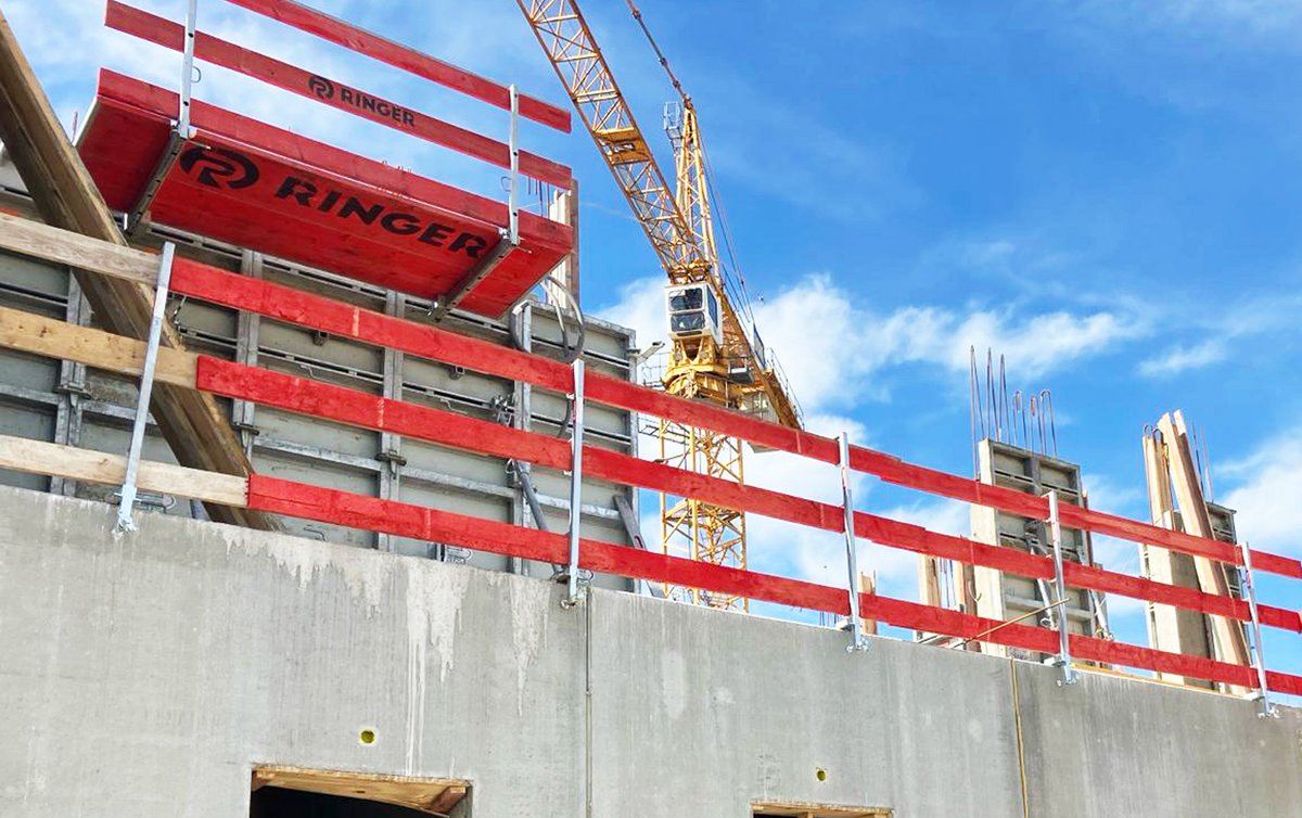 Die erforderliche Absturzsicherung wurde zum Teil mit der RINGER Deckenrandabschalung verstellbar hergestellt. Diese wurde mit Spannstahl und Kombiplatte in den bereits existierenden Ankerlöchern der Master PRO Wandschalung befestigt. Als Abschalung dienten liegende 30*300 cm Master PRO Elemente. Das System bietet somit 2 Vorteile in einem. Als zusätzliche Sicherung am Deckenrand wurden auch RINGER Brüstungszwingen verwendet.