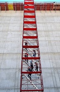 Ein entscheidendes Kriterium für den Erfolg der Baustelle waren die für den Aufstieg und vor allem für die entsprechende Fluchtmöglichkeit notwendigen Treppentürme. Der verwendete Treppenturm von RINGER basiert auf dem Doppelgeländer-Gerüst mit Alu-Gerüsttreppen. Die Lösung ist kostengünstig und bietet aufgrund ihrer Konstruktion den einzigartigen Vorteil, dass in jeder Höhe ein sicheres Aussteigen möglich ist. Die Basiskonstruktionen der insgesamt 6 Treppentürme wurden mit entsprechenden Sicherungen fix zusammengebaut und dann mit dem Kran an die jeweilige Endposition verhoben.