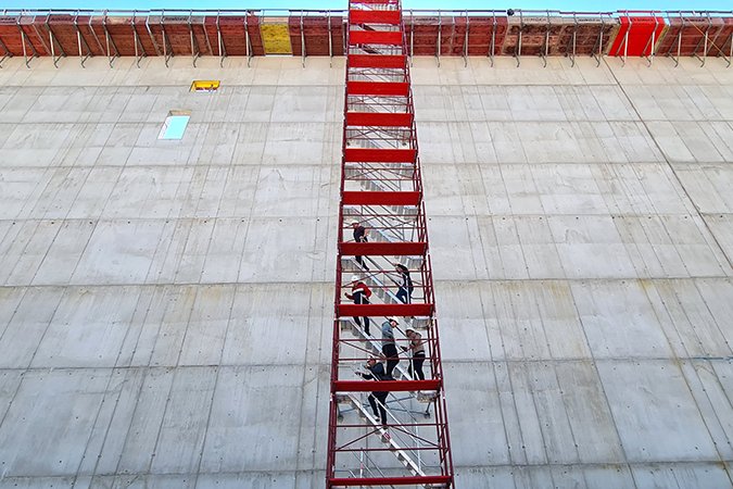 Ein entscheidendes Kriterium für den Erfolg der Baustelle waren die für den Aufstieg und vor allem für die entsprechende Fluchtmöglichkeit notwendigen Treppentürme. Der verwendete Treppenturm von RINGER basiert auf dem Doppelgeländer-Gerüst mit Alu-Gerüsttreppen. Die Lösung ist kostengünstig und bietet aufgrund ihrer Konstruktion den einzigartigen Vorteil, dass in jeder Höhe ein sicheres Aussteigen möglich ist. Die Basiskonstruktionen der insgesamt 6 Treppentürme wurden mit entsprechenden Sicherungen fix zusammengebaut und dann mit dem Kran an die jeweilige Endposition verhoben.