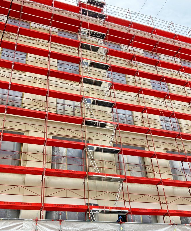 Die architektonisch anspruchsvolle Fassadengeometrie sowie die hochfrequentierte Innenstadtlage erforderten ein besonders flexibles und sicheres Gerüstsystem – genau hier spielt das RINGER Doppelgeländer Gerüst seine Stärken aus. Durch die hohe Systemflexibilität konnte die Gerüstkonstruktion mühelos an die Kontur des Gebäudes, inklusive der abgerundeten Eckfassade angepasst werden. Ein auskragender Fassadenvorsprung im oberen Bereich konnte mithilfe von Verbreiterungskonsolen präzise und normkonform hergestellt werden.