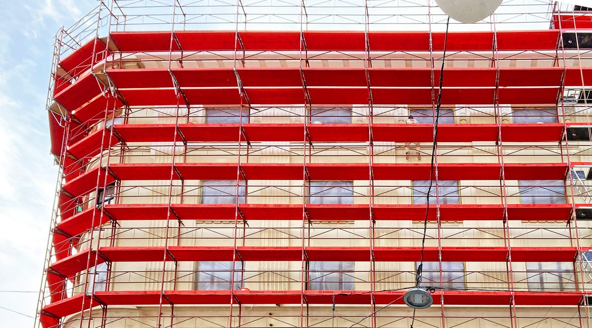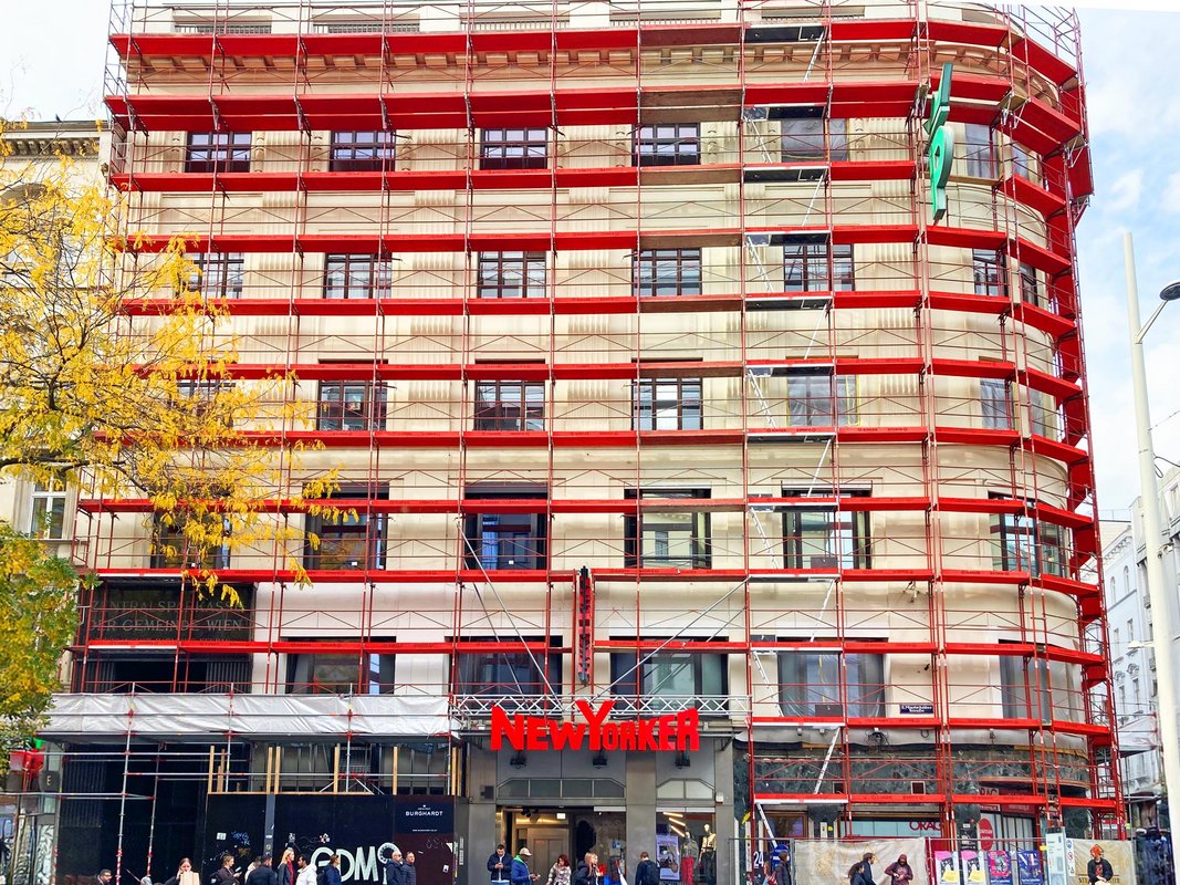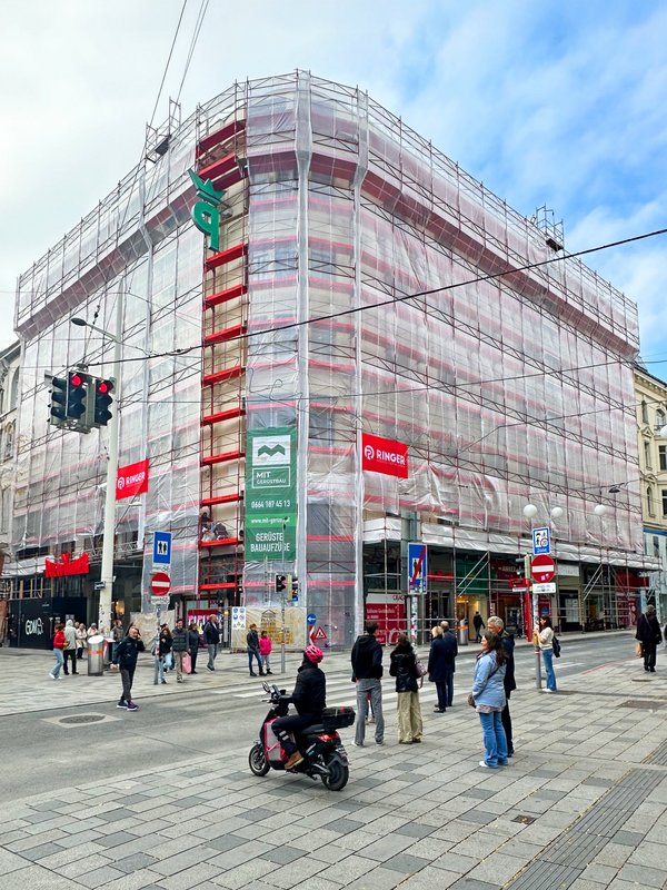 In der Wiener Mariahilfer Straße, an der Neubaugasse, wird ein mehrgeschossiges Bestandsgebäude mit charakteristisch geschwungener Eckfassade umfassend saniert. MIT Gerüstbau entschied sich dabei bewusst für das RINGER Doppelgeländer Gerüst – ein System, das in puncto Effizienz, Sicherheit und Anpassungsfähigkeit überzeugt.