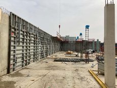 Am ehemaligen Gelände der Fa. Eisen Wagner in Ried im Innkreis entstand ein Neubau in Betonbauweise. Errichtet wurde das Gebäude, das künftig als Bürogebäude und Fitnessstudio genutzt wird, von der Fa. Wiesinger Bau GmbH aus Tumeltsham. Die Wände wurden mit der einseitig bedienbaren Schalung Master PRO geschalt. Als Schalhaut wurde die langlebige Vollkunststoff-Schalhaut von Alkus eingesetzt. Durch das perfekt abgestimmte Elementraster konnte der Grundriss schnell und effizient geschalt werden, die Bedienbarkeit von einer Seite unterstützt einen schnellen Baufortschritt. Aufgestockt wurde, wenn notwendig, mit liegenden Elementen. Für die erforderliche Sicherheit und Komfort beim Betonieren sorgte die Betonierbühne „L“ sowie in weiterer Folge die RINGER Kletterbühne.