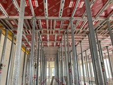 Die Decken, mit je nach Stockwerk variierenden Deckenhöhen von 3 bis 5 Metern, wurden mit der Elementdeckenschalung AluDEK geschalt. Die 1,35x1,35m großen Elemente ermöglichten ein schnelles Schalen im Regelbereich. Auch konnte dadurch ein gleichmäßiger Fugenverlauf des Deckenbildes erreicht werden. Passbereiche wurden mit Hilfe der AluDEK Auflageschiene und RINGER 3S Schalungsplatten schnell hergestellt.