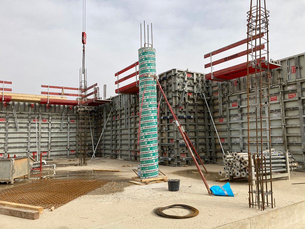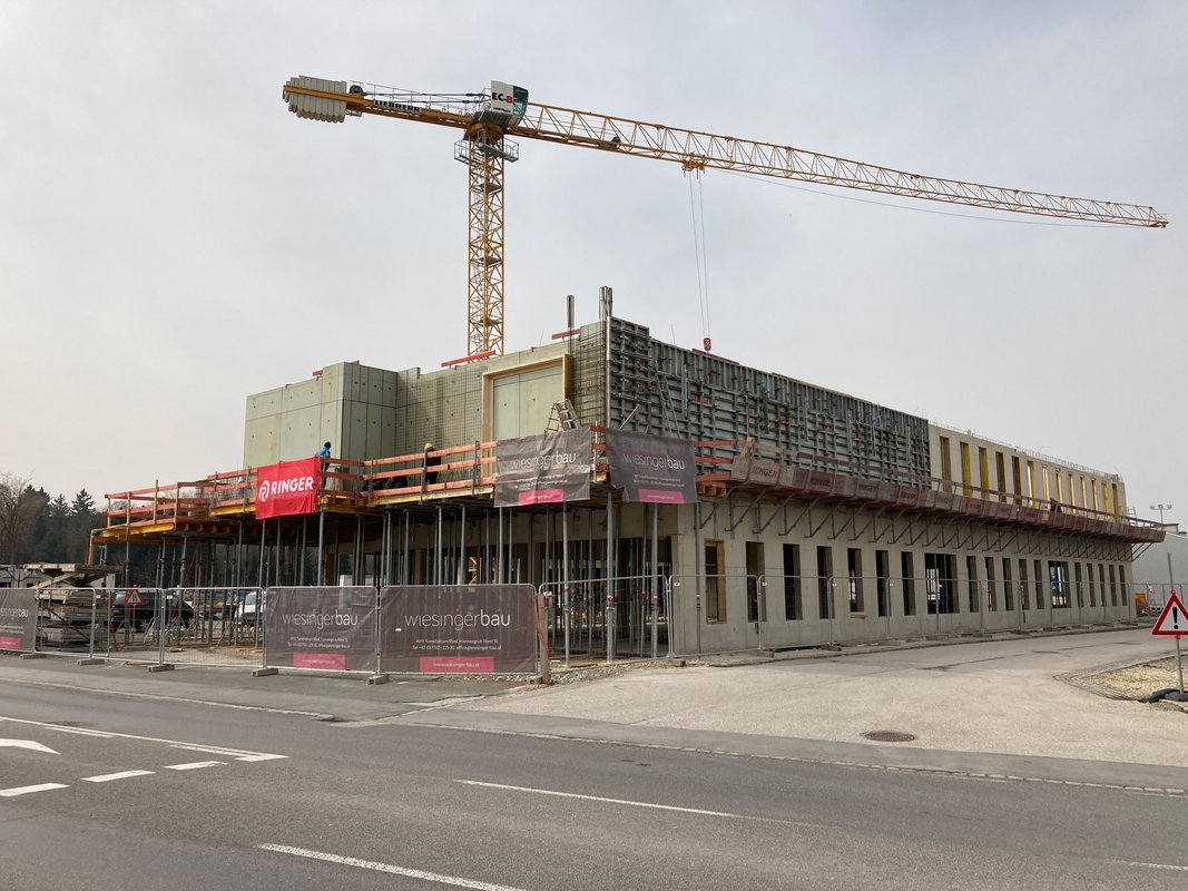 Am ehemaligen Gelände der Fa. Eisen Wagner in Ried im Innkreis entstand ein Neubau in Betonbauweise. Errichtet wurde das Gebäude, das künftig als Bürogebäude und Fitnessstudio genutzt wird, von der Fa. Wiesinger Bau GmbH aus Tumeltsham. Die Wände wurden mit der einseitig bedienbaren Schalung Master PRO geschalt. Als Schalhaut wurde die langlebige Vollkunststoff-Schalhaut von Alkus eingesetzt. Durch das perfekt abgestimmte Elementraster konnte der Grundriss schnell und effizient geschalt werden, die Bedienbarkeit von einer Seite unterstützt einen schnellen Baufortschritt. Aufgestockt wurde, wenn notwendig, mit liegenden Elementen. Für die erforderliche Sicherheit und Komfort beim Betonieren sorgte die Betonierbühne „L“ sowie in weiterer Folge die RINGER Kletterbühne.