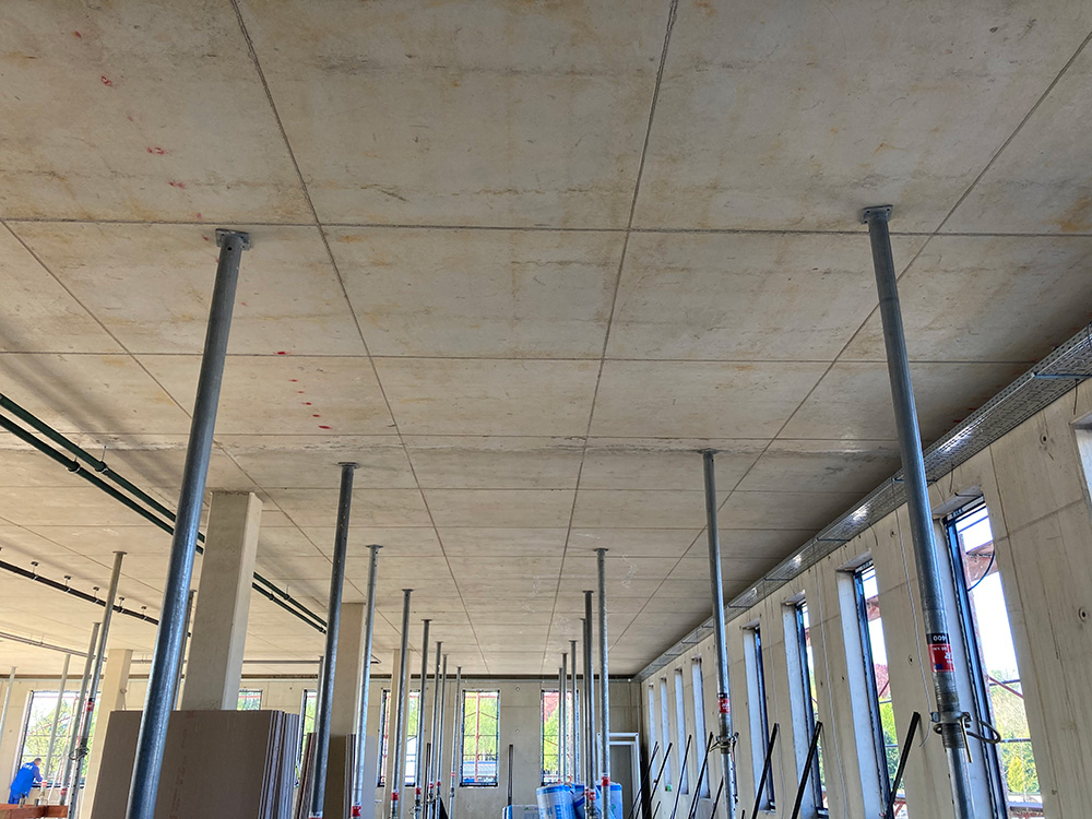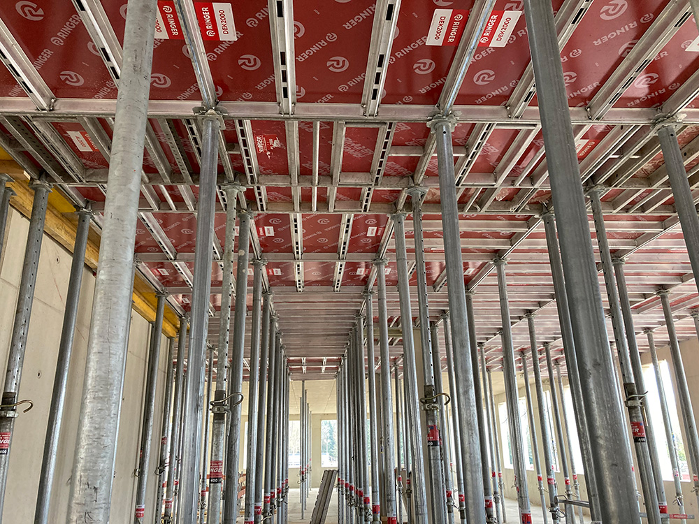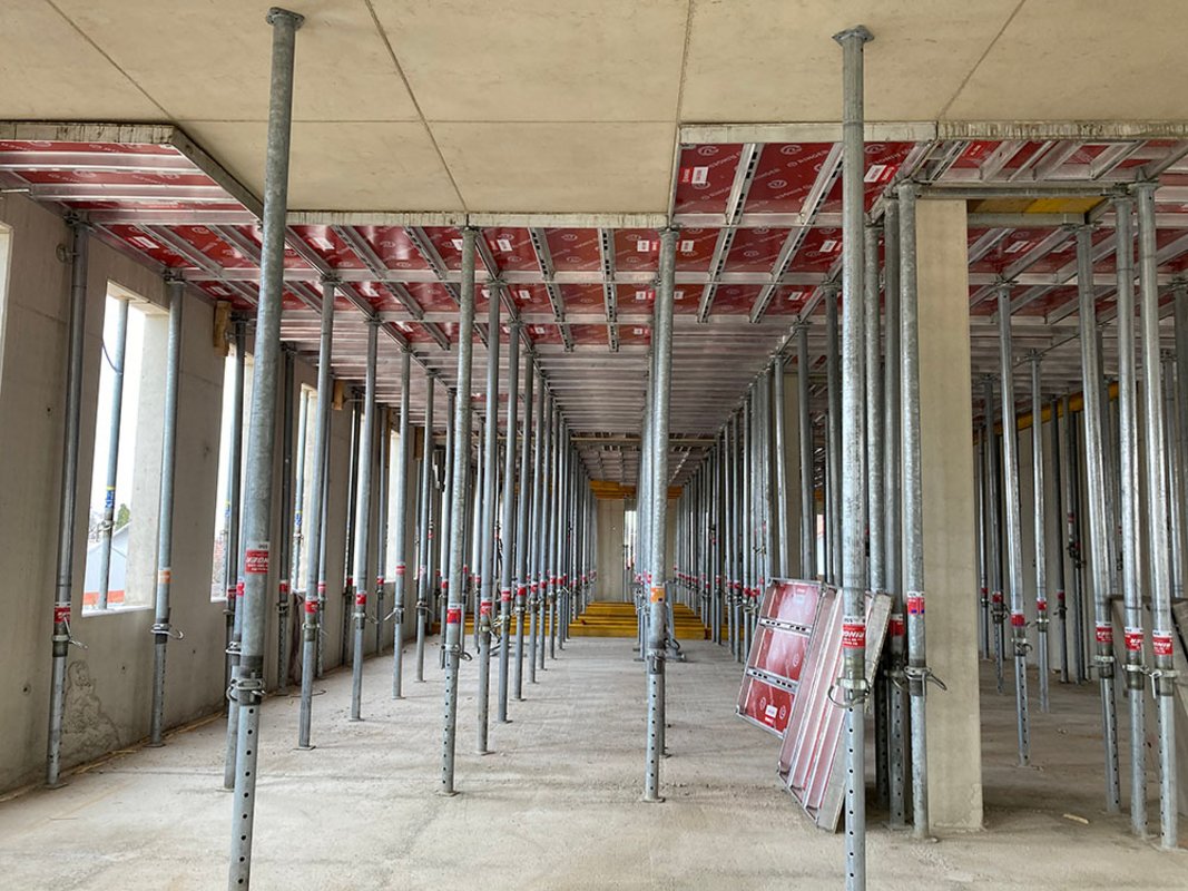 Die Decken, mit je nach Stockwerk variierenden Deckenhöhen von 3 bis 5 Metern, wurden mit der Elementdeckenschalung AluDEK geschalt. Die 1,35x1,35m großen Elemente ermöglichten ein schnelles Schalen im Regelbereich. Auch konnte dadurch ein gleichmäßiger Fugenverlauf des Deckenbildes erreicht werden. Passbereiche wurden mit Hilfe der AluDEK Auflageschiene und RINGER 3S Schalungsplatten schnell hergestellt.