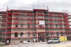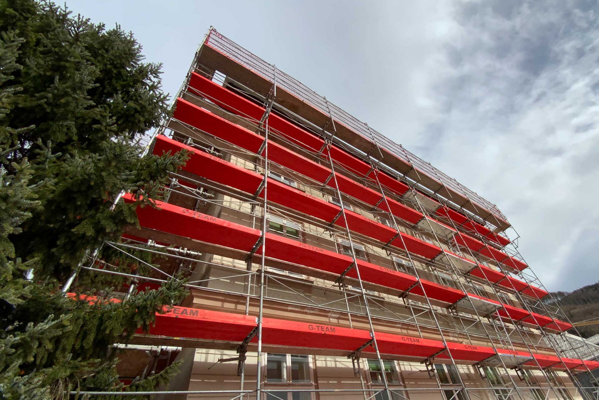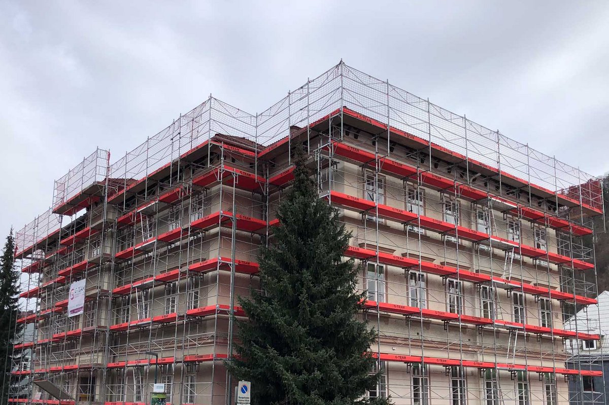 Das Gerüst war für die Fassaden- und Dacharbeiten insgesamt 8 Monate lang im Einsatz.