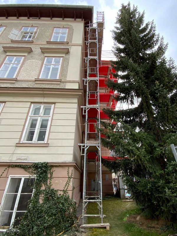 Bei Arbeiten in dieser Höhe sind zudem sichere Aufstiege unerlässlich. Durch die Verwendung von RINGER Alu-Bühnen mit Klappe und Leiter war ein einfacher Etagenwechsel möglich und die erforderliche Arbeitssicherheit zu jeder Zeit gewährleistetet. Aufgrund des Gesims am Gebäude, war es nötig, das Gerüst mit 30er-Konsolen und entsprechenden Belagsplatten zu verbreitern. Um für die Personen im Gebäude einen sicheren Zugang während der Sanierungsarbeiten zu gewährleisten, wurde ein Schutzdach über dem Eingangsbereich montiert.