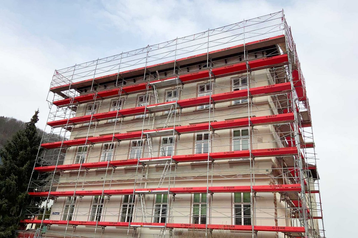 Die aufwändige Renovierung erforderte eine sorgfältige Planung und den Einsatz eines effizienten Gerüstsystems. Für die Arbeiten an der Fassade und auf dem Dach wurden von der Firma G-Team Gerüstverleih GmbH rund 2.457m² RINGER Doppelgeländer-Gerüst in verzinkter Ausführung eingesetzt. Um das dreistöckige Gebäude vollständig einzurüsten, waren insgesamt 8 Gerüstetagen erforderlich. Dieses Fassadengerüst ermöglichte den geschützten Zugang zu den Arbeitsbereichen und trug erheblich zur effizienten und sicheren Durchführung der Arbeiten bei. Ob Sanierung, Neubau oder Spezialprojekte – bei uns können Sie passende Gerüste und Schalungen kaufen.