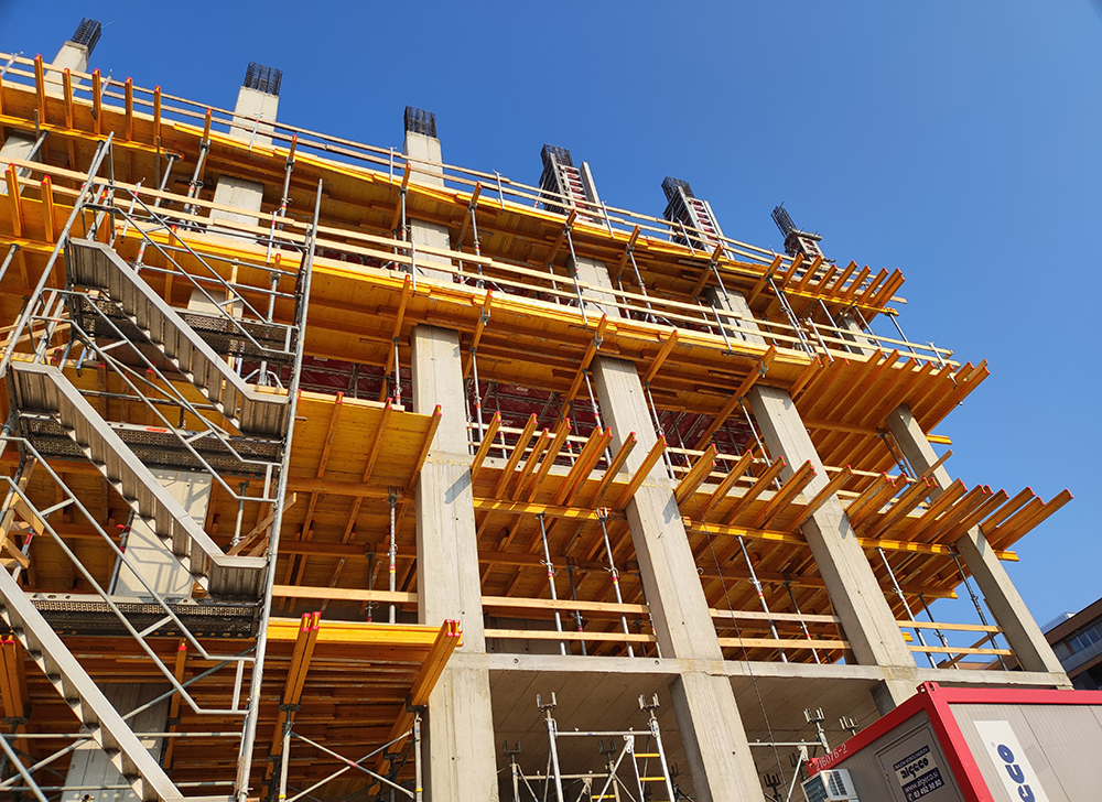 Zur raschen und kosteneffizienten Schalung der Decken kommt die RINGER AluDEK zum Einsatz. Insgesamt 3000m² der leichten Aluminiumrahmenschalung (16kg/m²) sorgen für zügigen Baufortschritt. Das System kombiniert die Vorteile einer Element-Deckenschalung mit den Vorteilen einer herkömmlichen Trägerschalung. Dank der ausgereiften, stabilen Aluminiumkonstruktion können Decken bis zu 30cm Stärke ohne Zusatzunterstellung betoniert werden. Standard-Deckenstützen mit einer Belastbarkeit von 20kN sind ausreichend. In den auskragenden Bereichen kommen RINGER Deckentische zum Einsatz, Passbereiche werden mit dem RINGER Flex – System gelöst. Für die notwendige Sicherheit am Bau und Komfort beim Betonieren sorgen Kletterbühnen. Als Fassadengerüst wurde das RINGER Doppelgeländer Gerüst eingesetzt.