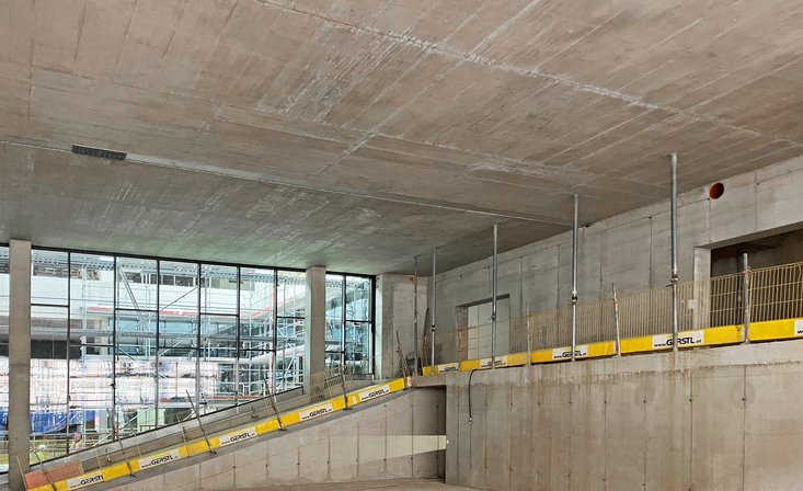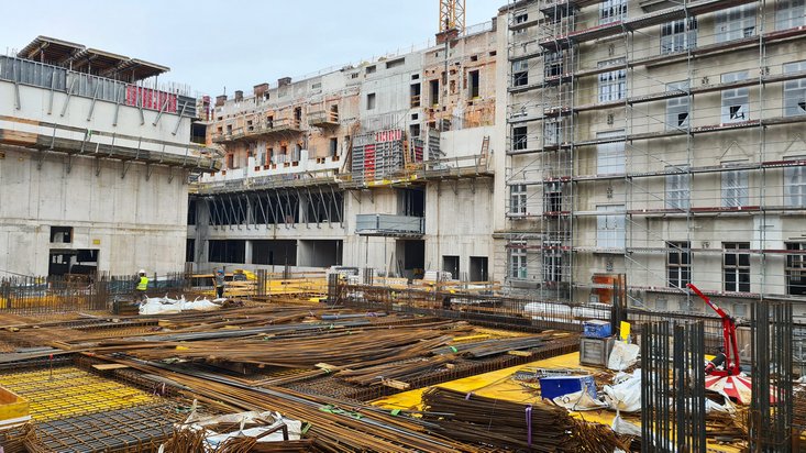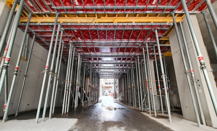Bei der im Rahmen des Projektes angewendeten Deckelbauweise der 4 Untergeschosse wurden provisorische Hilfssäulen errichtet. Mit der Fertigstellung der Decken und der Errichtung der finalen Stützen können diese temporären Elemente nun schrittweise entfernt werden.