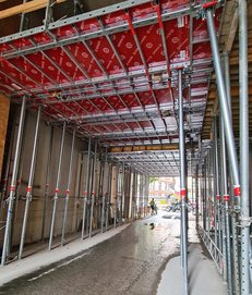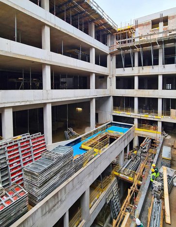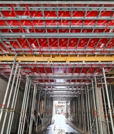 Zur Optimierung des Baustellenbetriebs und Erleichterung des Materialtransports wurden spezielle Maßnahmen umgesetzt. In noch nicht betonierten Bereichen, die mit DEKplus Deckentischen eingeschalt wurden, platzierte man die Deckenstützen in größerem Abstand. Durch den flexiblen Schwenkkopf der Deckentische ließ sich zudem die innerste Reihe der Deckenstützen vorübergehend schräg stellen. Diese Anpassungen gewährleisten die erforderliche Durchfahrtsbreite für LKWs, ohne die Stabilität der Schalung zu beeinträchtigen. So können die Fahrzeuge weiterhin durch Passagen ins Innere des Rohbaus gelangen, was die Logistikprozesse erheblich erleichtert.