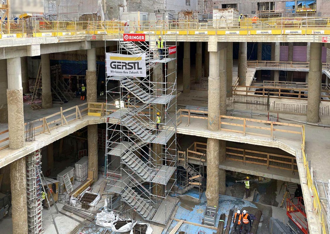 Um die Bestandsgebäude außerhalb der Deckelbauweise zugänglich zu machen, setzte man einen RINGER Doppelgeländer Gerüsttreppenturm ein. Diese Konstruktion, die sich über 12 Stockwerke und eine Höhe von 24 Metern erstreckte, optimierte den Zugang auf die verschiedenen Ebenen.