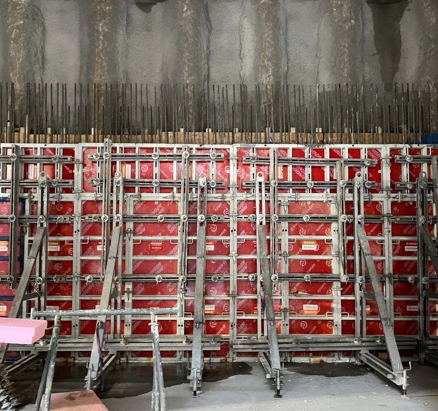 > Während der Spitzenphasen des Projekts bestand eine hohe Nachfrage nach Schalungsmaterialien. Beispielsweise benötigte der Rohbau in bestimmten Abschnitten bis zu 400 Einheiten der Alu Master Wandschalungselemente mit den Maßen 270 x 90cm.