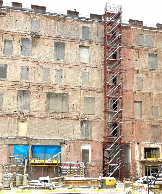 Zur effizienten Erschließung unterschiedlicher Baustellenbereiche mit nur einem Gerüsttreppenturm, wurde dieser mehrmals per Kran an die gewünschte Position verhoben.