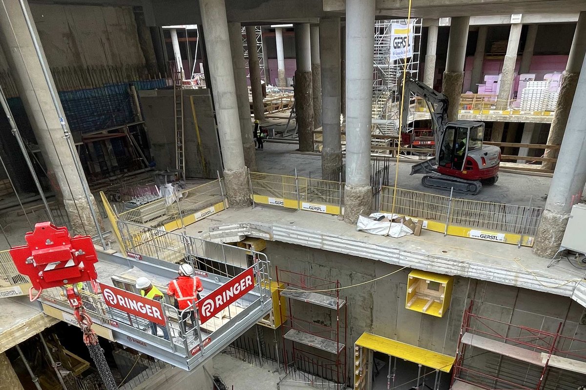 Bei der Realisierung dieses komplexen Bauprojekts waren Schalungen und Gerüstsysteme aus dem RINGER-Mietservice im Einsatz. Angesichts der Herausforderungen beim Manövrieren der Schalung in der Deckelbauweise erwiesen sich die Belastbarkeit und das geringe Gewicht der RINGER Schalungen als besonders vorteilhaft. RINGER unterstütze die für das Hauptbaufeld verantwortliche Firma GERSTL BAU GMBH & CO KG zudem durch wertvolle technische Expertise, innovative Lösungsansätze und hochwertige Materialien, um einen effizienten Baufortschritt zu gewährleisten.