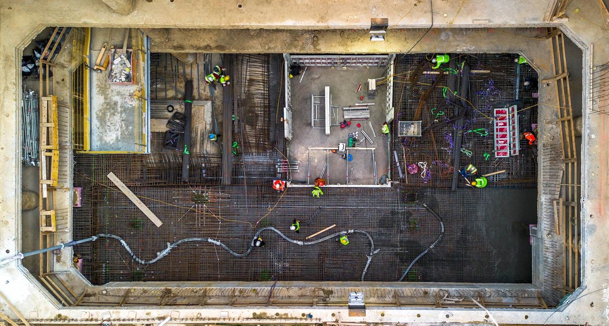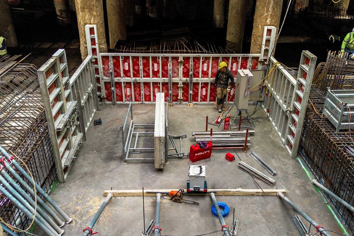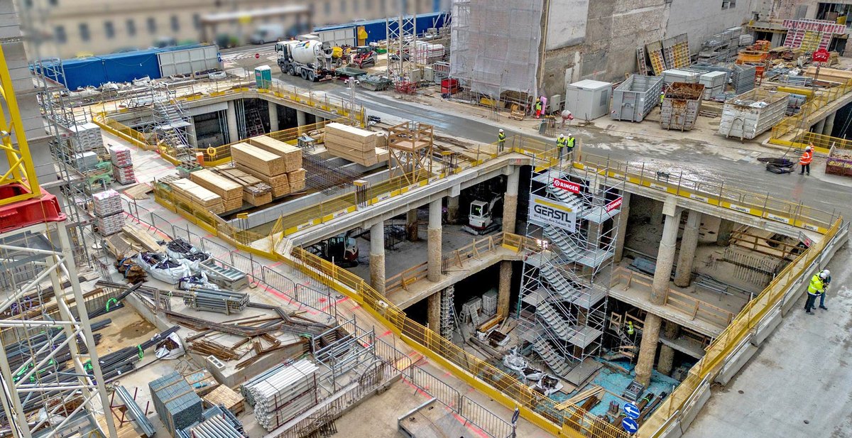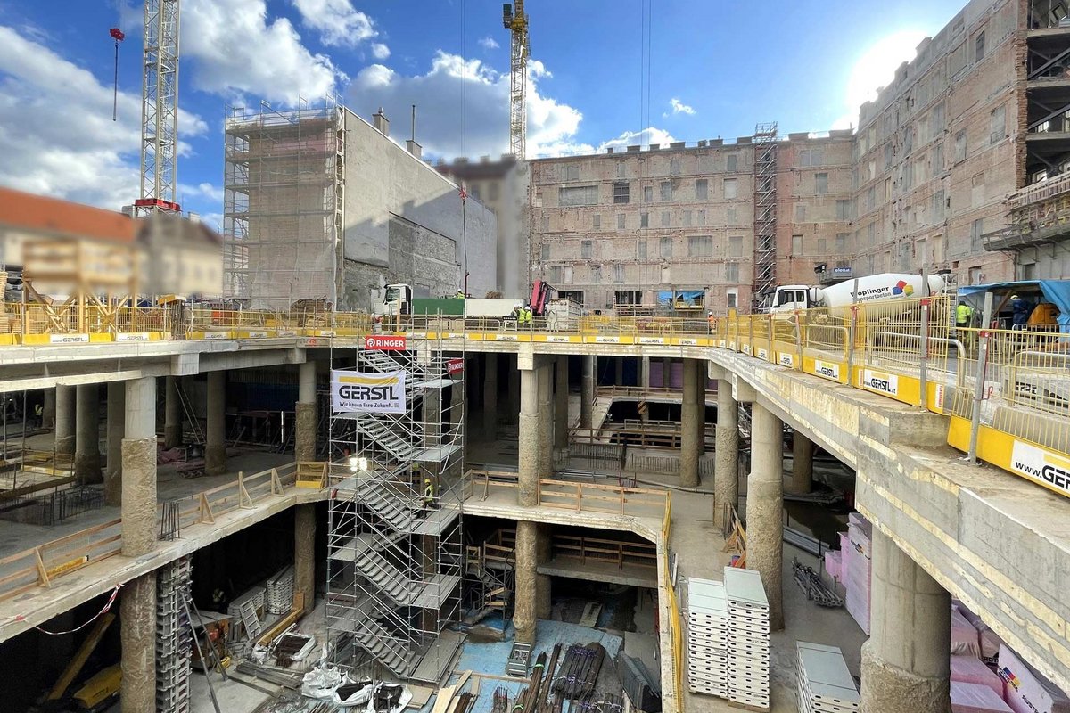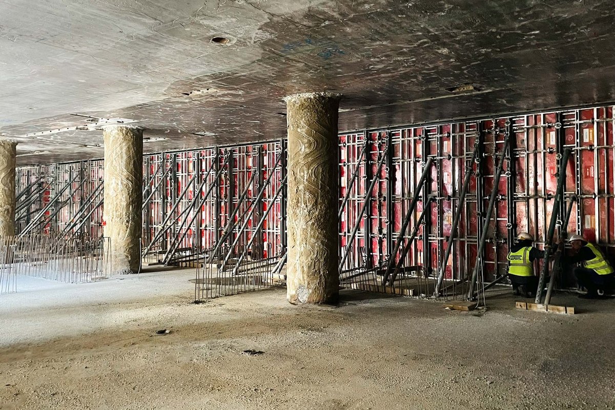 Bei der im Rahmen des Projektes angewendeten Deckelbauweise der 4 Untergeschosse wurden provisorische Hilfssäulen errichtet. Mit der Fertigstellung der Decken und der Errichtung der finalen Stützen können diese temporären Elemente nun schrittweise entfernt werden.