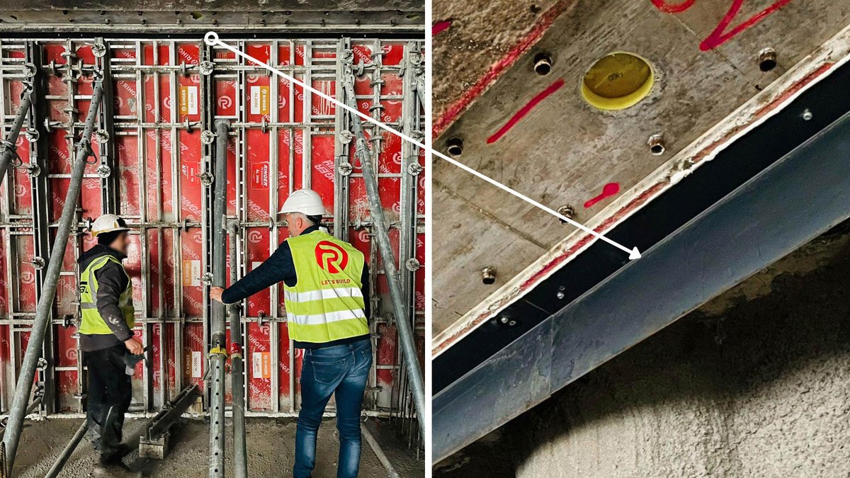 Für all jene Wände mit einer Betonierhöhe von 6 Metern, wurde eine kombinierte Schaltechnik mit Alu Master angewandt. Zunächst wurden im unteren Wandbereich die Schalelemente mittels Stützbock M befestigt und bis zu einer Höhe von 3,5 Metern betoniert. Um die Ankerstabilität beim Betonieren der darüber liegenden Schalungsebene zu gewährleisten, wurde eine Verbindung mittels Plattenanker (8mm Flacheisen, 10x12cm, mittig aufgeschweißter DW 15 Ankerstab) im oberen Bereich der ersten Schalungsebene mit einbetoniert. Im Anschluss wurden jeweils immer drei 270x90cm Alu Master Elemente querliegend auf Kletterbühnenadapter montiert. Die Schalung wurde mit vertikal angebrachten Ankerriegeln auf 3m im unteren Bereich am Plattenanker befestigt und zusätzlich mit Richtschienen 150 mittels Ankerhülsen fixiert. Im oberen Bereich wurden Stahlblechwinkel an der Deckenuntersicht montiert, um die Horizontalkräfte aufzunehmen.