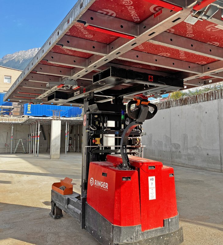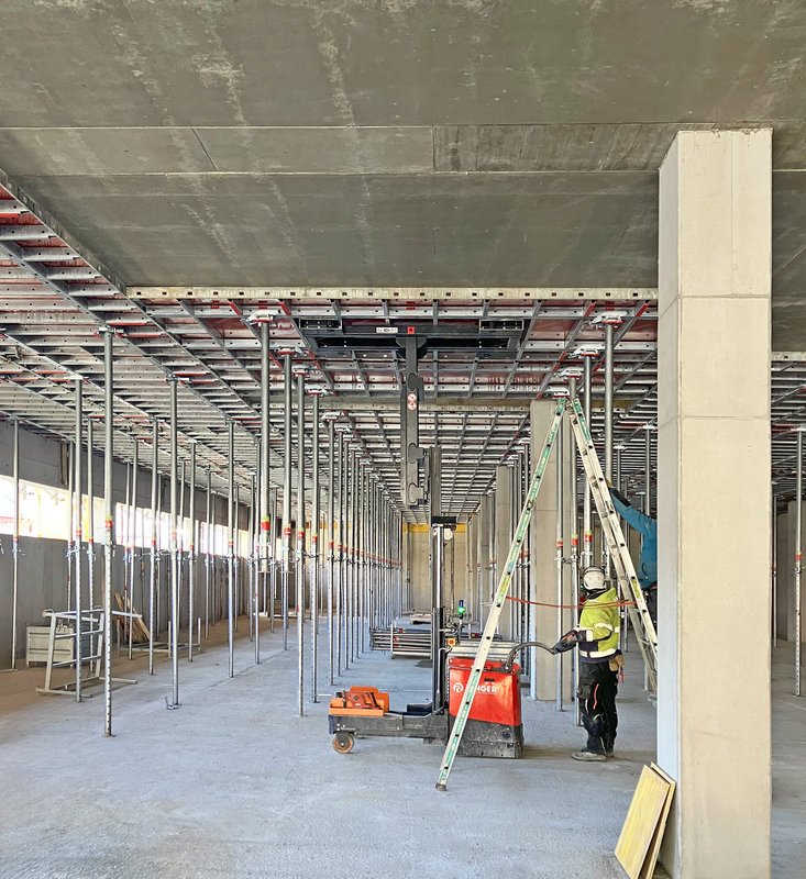 Für die Herstellung der rund 9.300 m² umfassenden Deckenflächen kam unter anderem die RINGER Deckenschalung-Systemfamilie zum Einsatz – bestehend aus den großflächigen DEKplus Deckentischen und der handlichen AluDEK Moduldeckenschalung. Die Kombination aus Geschwindigkeit, Flexibilität und Sicherheit war maßgeblich für den zügigen Baufortschritt.