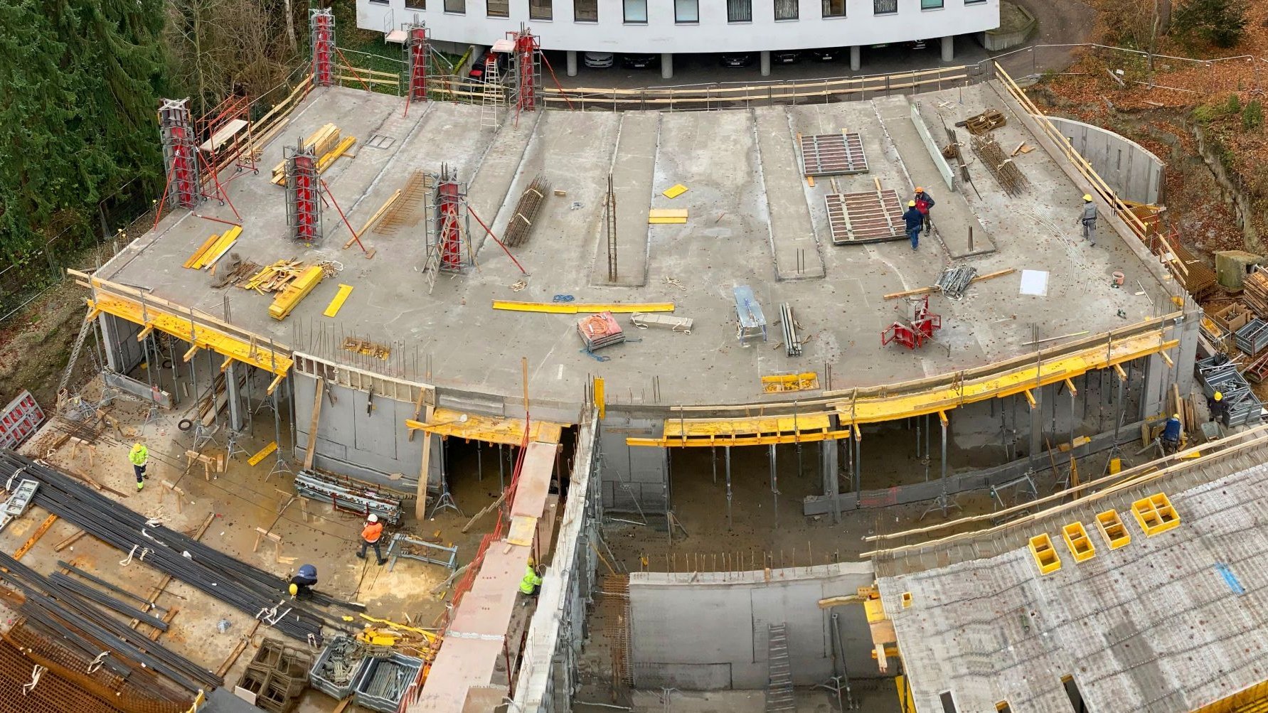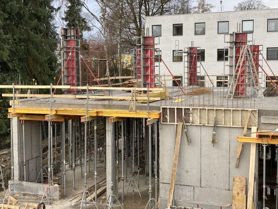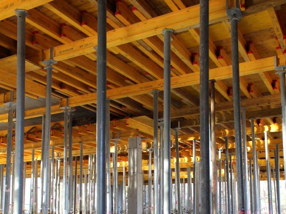 Das in die Jahre gekommene Gebäude der Arbeiterkammer Ried im Innkreis wird aktuell an selber Stelle neu errichtet. Der Neubau mit drei Gebäudeteilen orientiert sich am Umfeld und umfasst zwei Geschoße inklusive Tiefgarage mit rund 80 Auto-Stellplätzen. Die Firma Kieninger Wels ist mit den Ausführungsarbeiten für den Rohbau beauftragt. Bei der Schalung der Geschoßdecken setzte man auf die bewährte Flex-Schalung von RINGER. Säulen wurden mit der PAX-Stützenschalung ausgeführt.