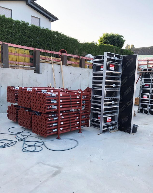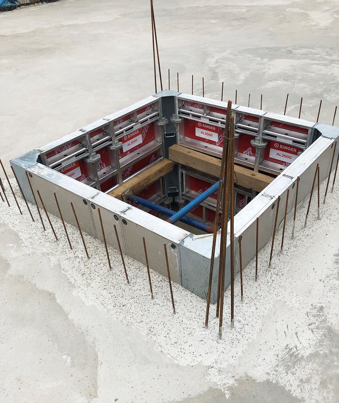 Durchgeführt wird das Projekt von der SVS BAU GmbH in Troisdorf. Für die Aufzugsunterfahrten kam die RINGER AL2000 Schalung mit einer Höhe von 1,35m zum Einsatz. Dank der leichten Aluminiumelemente eignet sich diese Schalung besonders gut für enge beziehungsweise räumlich limitierte Schalungsaufgaben. Die Wände der Tiefgarage inklusive Aufzug und Treppenhaus wurden mit der AL2000 mit einer Höhe von 2,70m geschalt. Die leichten Profile machen einen einfachen Aufbau per Hand und mit nur einem Arbeiter möglich. Dadurch konnte an Arbeitszeit und den damit verbundenen Kosten eingespart werden. Im Produktportfolio der AL2000 Serie sind unter anderem auch UNI-Elemente enthalten. Diese wurden zum Schalen der Stützen verwendet. Für die Unterstützung der Filigrandecken kommen Ringer Deckenstützen B 30 sowie Ringer H20 Träger und Zubehör zum Einsatz.