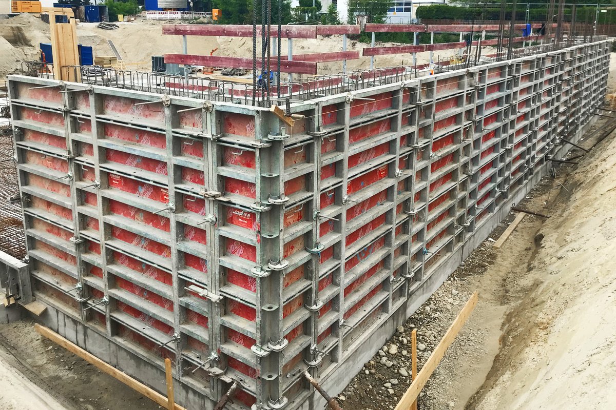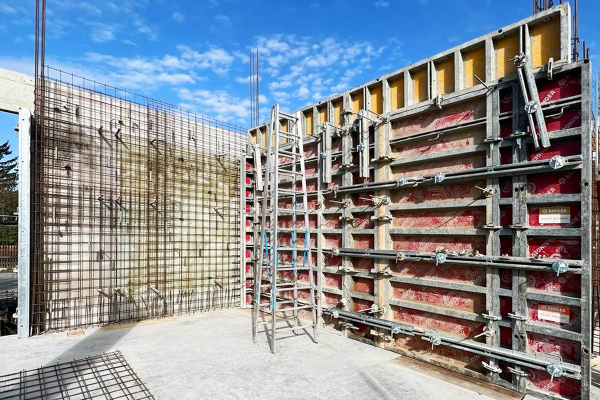 Beim Bau der Wände in der Tiefgarage setzte Paul Meister auf das leistungsstarke Stahl Master Wandschalungssystem. Stark, flexibel und robust, bietet diese Stahlrahmenschalung die perfekte Lösung für großflächiges Schalen und das mit einem Betondruck bis zu 80 kN/m². In Kombination mit RINGER Richtstützen und der Betonierbühne wurde eine schnelle, sichere und präzise Ausführung gewährleistet.