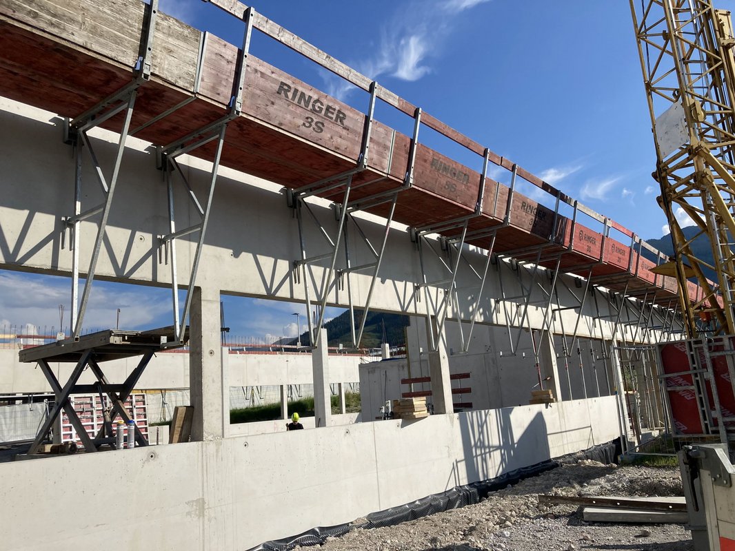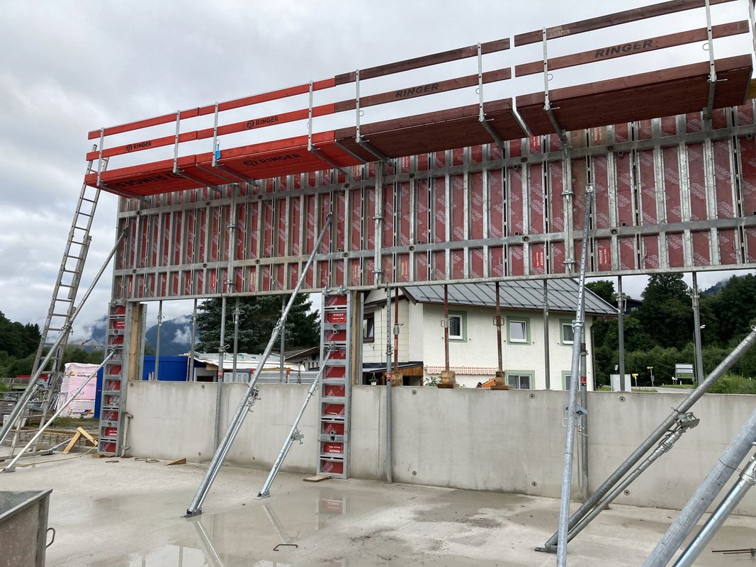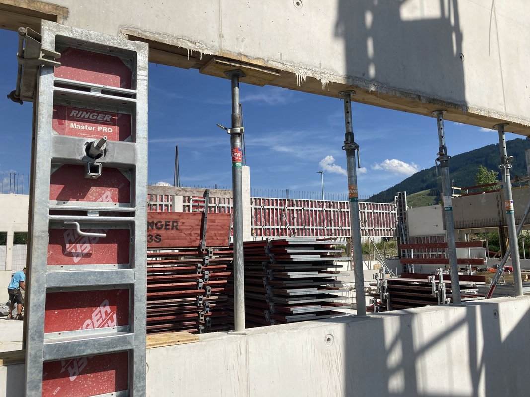 Die Decke wurde mit den vorgefertigten RINGER Deckentischengeschalt, was eine erhebliche Zeitersparnis mit sich brachte. Zusätzlich kamen bei diesem Bauvorhaben auch die RINGER Betonierbühnen und 3S-Bühnen zum Einsatz. RINGER-Bühnen garantieren einen flexiblen und sicheren Einsatz.
