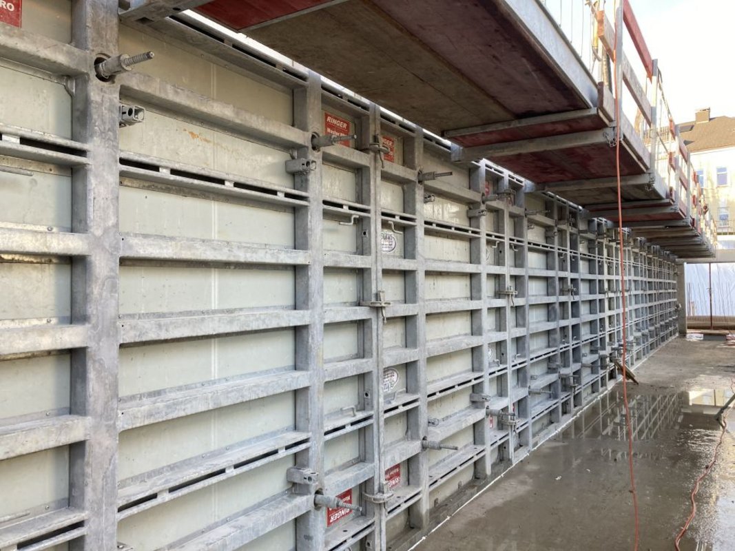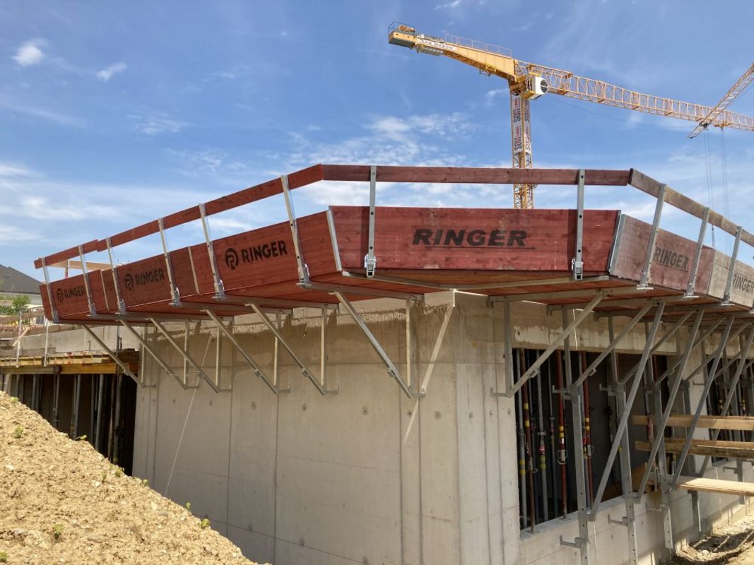 Zentrale Rollen spielen beim Neubau Schalungs- und Gerüstsysteme von RINGER. Die Schalung der Wände erfolgt mit der neuen, einseitig bedienbaren Wandschalung Master PRO. Mit Elementgrößen von bis zu 300x240cm konnten auch großen Flächen schnell geschalt werden. Durch den reduzierten Zeitaufwand beim einseitigen Ankern sowie der großen Schalungsfläche pro Anker konnten die Arbeitskosten deutlich reduziert werden.