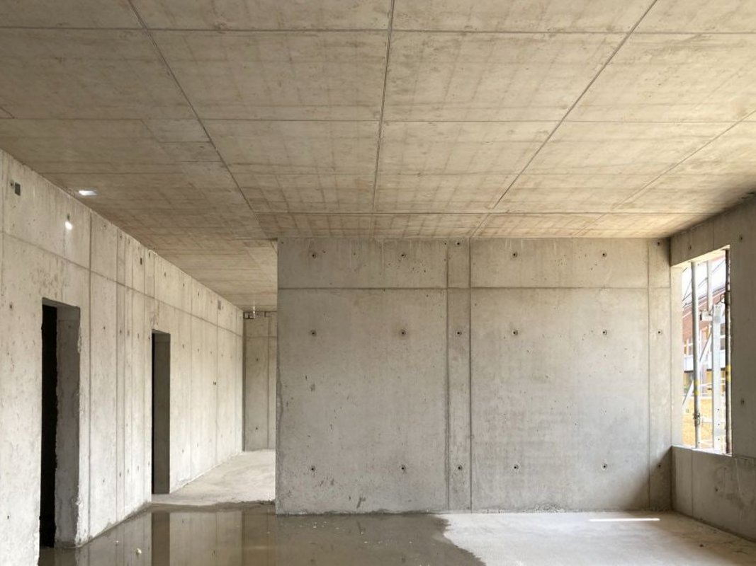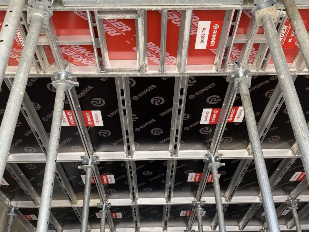 Beim Schalen der Decken kam die extraleichte Deckenschalung AluDEK zum Einsatz. Das System besteht aus nur drei zentralen Bauteilen, dem Deckenschalungselement, dem RINGER AluDEK Kopf sowie Standard-Deckenstützen. Das aus stabilen Aluminiumprofilen bestehende Schalelement mit den Abmessungen 1,35 x 1,35m (1,82m²) sorgte für ein schnelles Schalen im Regelbereich. Das geringe Gewicht der Elemente von nur 16kg/m² entlastete zusätzlich die Arbeiter auf der Baustelle.