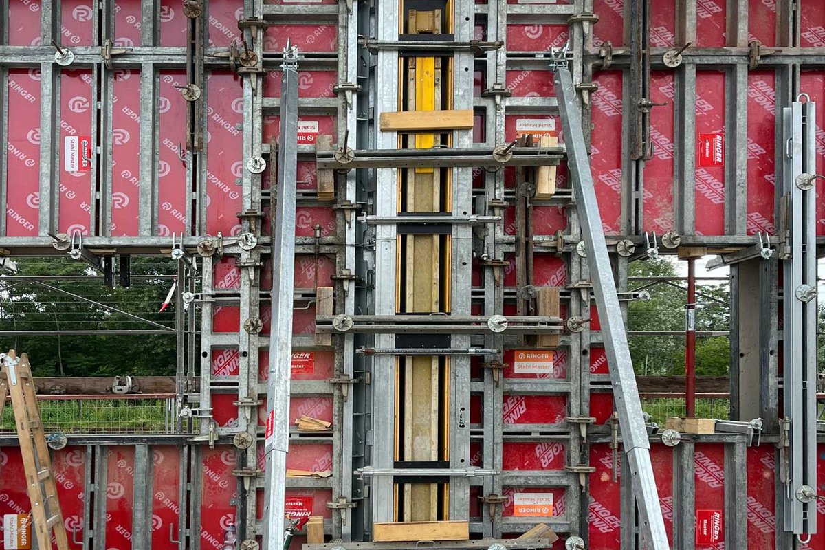Nach jedem Betonierabschnitt wurden diese Elementverbunde mit dem Kran zur jeweils nächsten Position gehoben. Für die finale Einrichtung der Wandschalung kamen RINGER Richtstützen zum Einsatz.