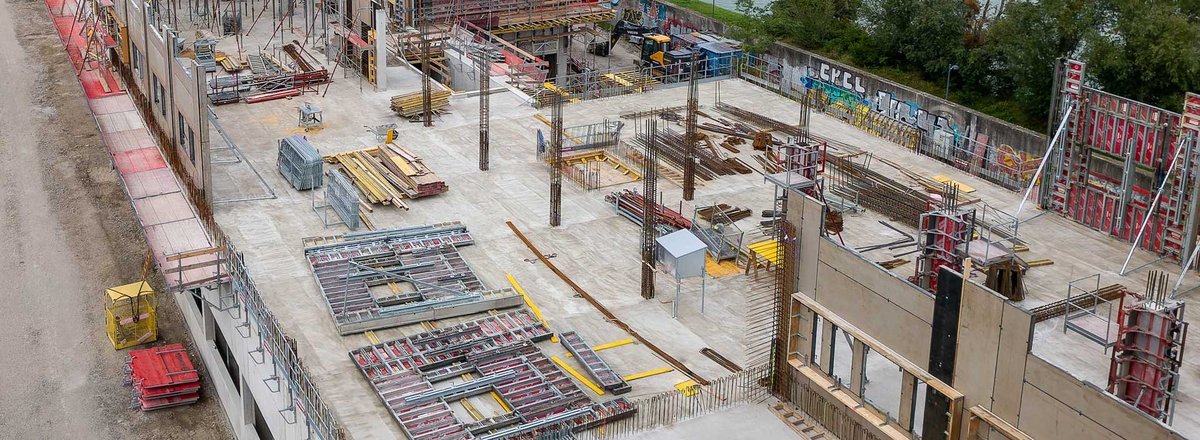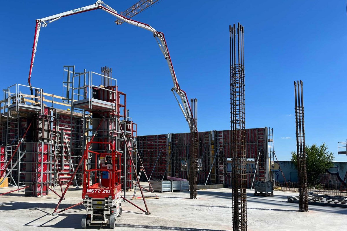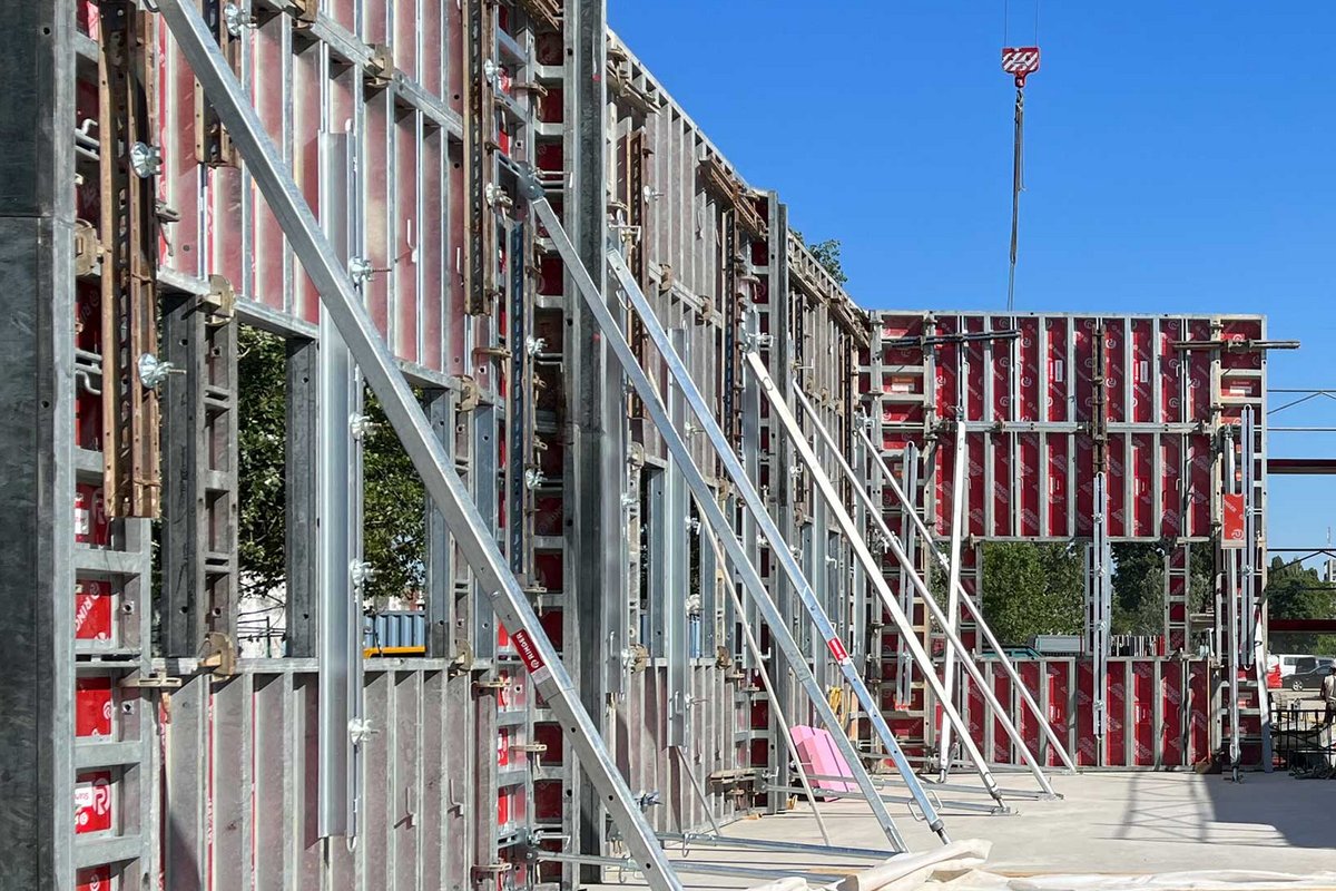 Bei der Wandschalung der Gebäude galt es, hohe Anforderungen an Flexibilität und Robustheit sowie den engen Zeitrahmen für die Errichtung zu meistern, was eine planerische und logistische Herausforderung darstellte. Als Lösung wurde schließlich Stahl Master von RINGER gewählt. Mit einem maximalen Frischbetondruck von 80kN/m² ist diese Stahlrahmenschalung für den härtesten Einsatz konzipiert.