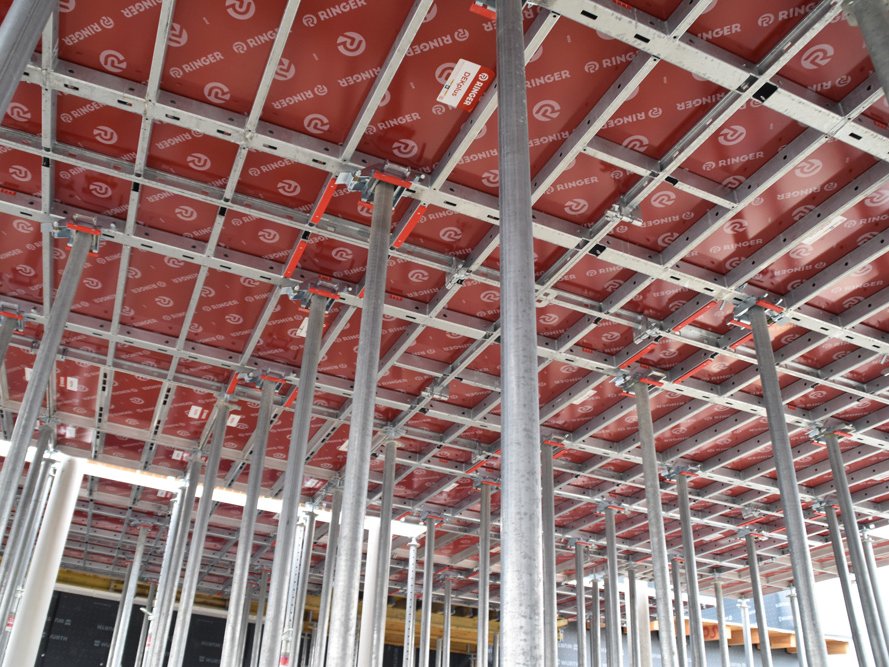 Die spezielle Charakteristik des Bauvorhabens erforderte, dass die gesamte Decke ausschließlich auf den darunterliegenden Säulen liegt. Da es aufgrund dieser Anforderung keine Wände zur seitlichen Fixierung der Deckenschalung gab, war die Lösung der Deckentisch DEKplus von RINGER. Bei diesem Schalungssystem werden die Deckenstützen über dem DEKplus-Kopf nahezu spielfrei miteinander verbunden. Dadurch entsteht eine kraftschlüssige Verbindung, die jedem einzelnen Element einen äußerst stabilen Stand verleiht.