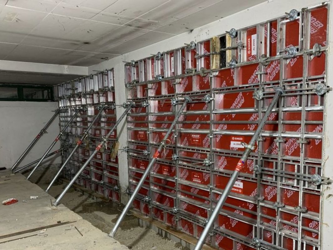 Speziell beim Kellergeschoss konnte unsere AL2000 Schalung überzeugen. Dank des einfachen Handlings ohne Kran sowie den verschiedenen Elementgrößen überzeugte unsere „Allrounderin“ beim Schalen von den engen und teils schwer erreichbaren Kellerräumen. Geschalt wurden im ersten Bauabschnitt die Fundamente sowie die Trennwände im Keller. Bei einer Gesamtfläche von 230m² wurde die AL2000 zum Teil einhäusig und ohne Stützböcke eingebaut. Das Versetzten der Elemente erfolgte von Hand. Betoniert wurde von oben durch eine Öffnung (Kernbohrung) in der Decke/Unterzug, verdichtet wurde der Beton mit einem Außen-Rüttler. Die Fertigstellung des Schulgebäudes ist mit Ende 2022 geplant.