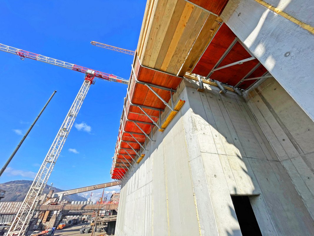 In der ersten Ebene (400 m²) wurde mit Flex Schalung gearbeitet. Die seitliche Abschalung erfolgte mit AL2000 und Master PRO Elementen. Die 40 cm starke Decke integrierte 60 cm breite Unterzüge, wobei ein Traggerüstsystem die Lasten zuverlässig abtrug. Die zweite Decke (670 m²) lag teilweise auf 14,4 m Höhe und wurde mit DEKplus, H20-Trägern und AluDEK geschalt. Die Kombination ermöglichte trotz großer Höhe ein effizientes und sicheres Arbeiten.