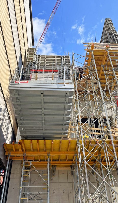 Gerade bei der Errichtung der hochliegenden Deckenebenen war eine platzsparende und sichere Materialbereitstellung entscheidend. Mit einer Tragfähigkeit von bis zu 5 Tonnen bot sie ausreichend Kapazität für schwere Bauteile, Schalungselemente und Bewehrungsmaterialien. Ein besonderer Vorteil war die Erleichterung beim Ein- und Ausschalen der DEKplus Deckentische. Durch die Positionierung der Bühne am jeweiligen Geschoss konnten die Deckentische mit den bereits montierten Deckenstützen direkt am Einsatzort abgelegt und an die benötigte Stelle versetzt werden, was die Schalungsarbeiten erheblich beschleunigte.