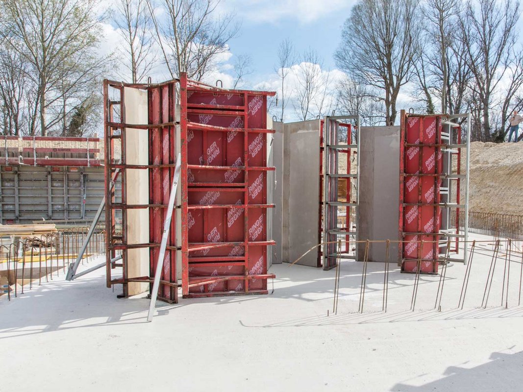 Um den straffen Zeitplan einhalten zu können wurden die Wände mit großflächigen Master PRO Elementen geschalt. Dank der Hauptelemente mit Abmessungen 300x240 cm und einem max. zulässigen Betondruck von 80kN/m² konnten die Wände rasch hergestellt werden. Der Vorteil dieser hochwertigen Stahlrahmenschalung liegt zudem klar in der einseitigen Bedienbarkeit. Durch den reduzierten Zeitaufwand beim einseitigen Ankern sowie der großen Schalungsfläche pro Anker kann die Arbeitszeit im Vergleich zu konventionellen Systemen deutlich reduziert werden. Zudem schafft das symmetrische Ankerraster ein perfektes Sichtbetonergebnis mit horizontal und vertikal fluchtendendem Ankerbild. Für die nötige Sicherheit beim Betonieren wurden Betonierbühnen L mit dem Kran oben in den Master PRO Schalungselementen eingehängt. Die montagefertigen Einheiten mit aufklappbarem Geländer waren mit wenigen Handgriffen einsatzbereit.