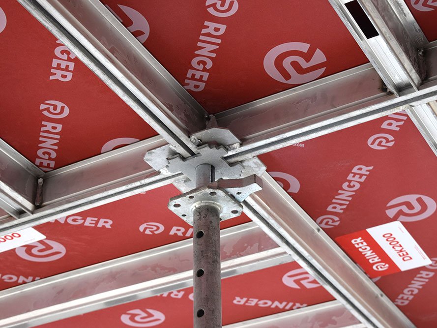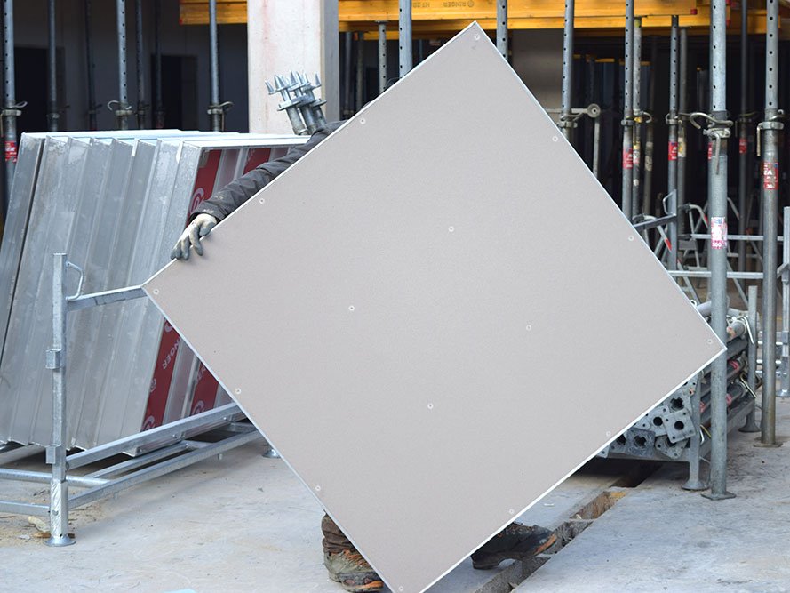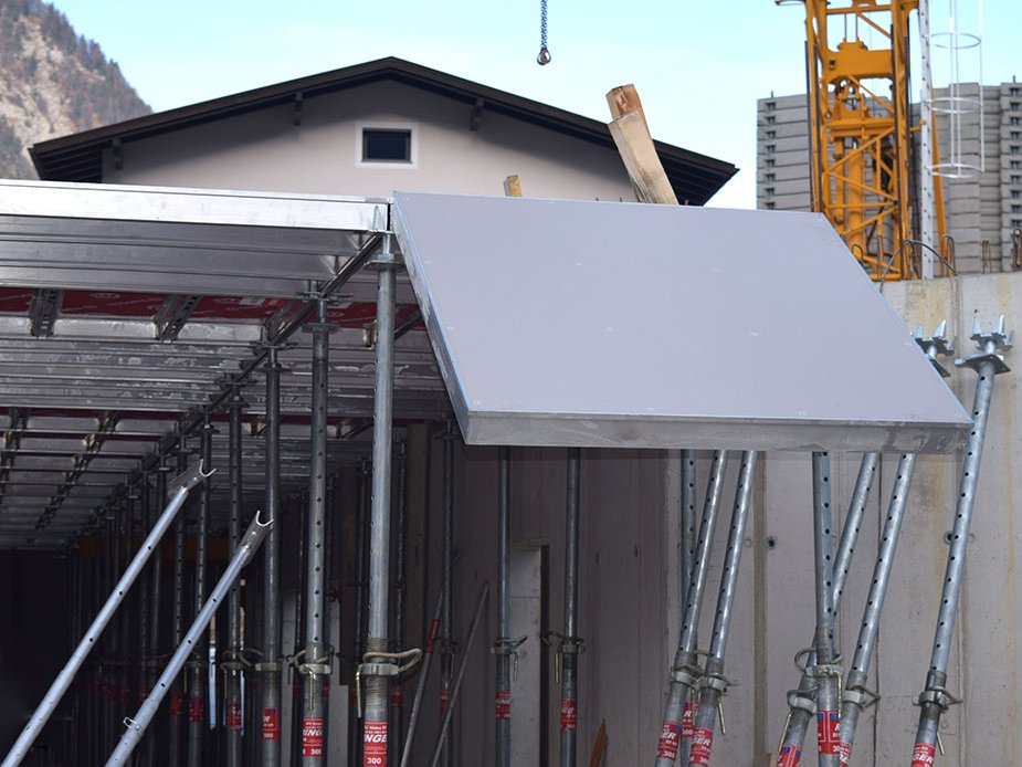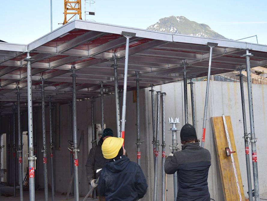 Neben der bewährten Stahl Master Wandschalung spielte beim Neubau vor allem das leichte Deckenschalungssystem AluDEK eine zentrale Rolle. Durch den funktionalen AluDEK-Trägerkopf, der sowohl im Eck, am Rand und in der Fläche eingesetzt werden kann, ging auch der Baufortschritt zügig voran. Die Montage vom Boden aus ist durch das geringe Gewicht der Schalungselemente mit nur 16kg/m² ideal.