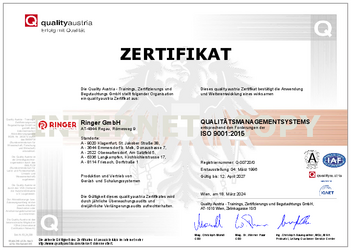 Seit 1996 setzt RINGER auf ein zertifiziertes Qualitätsmanagementsystem nach ISO 9001:2015. Dieser Meilenstein ist ein zentraler Bestandteil unserer Erfolgsgeschichte und hat unser kontinuierliches Wachstum seit 1998 unterstützt. Bald feiern wir stolz das 30-jährige Jubiläum dieser Qualitätszertifizierung.