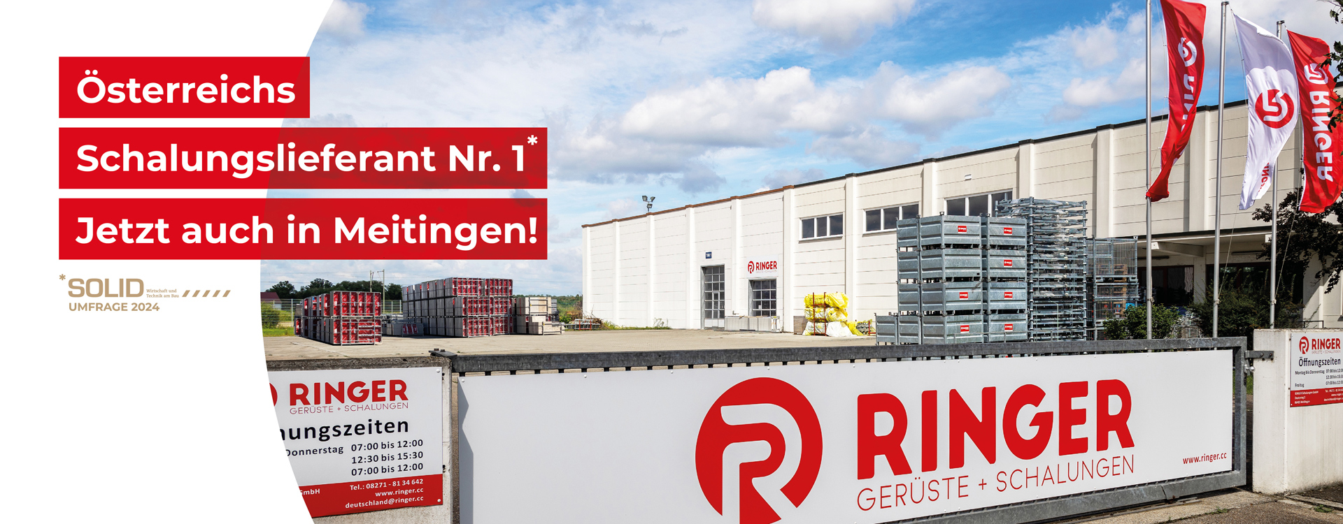 Die RINGER GmbH gibt die Eröffnung ihres neuen Standorts in Meitingen, Bayern, bekannt. Seit dem 1. Juli 2024 steht unser breites Sortiment an Wandschalungen, Deckenschalungen, Gerüsten und Zubehör auch in D-86405 Meitingen, Deutzring 2, zur Verfügung.