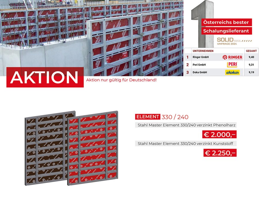 Sie suchen hochwertige Schalungen zu attraktiven Konditionen? Bei RINGER bieten wir Ihnen hochwertige Schalungssysteme, die perfekt auf Ihre Anforderungen zugeschnitten sind. Mit unseren aktuellen Aktionen für Schalungen sparen Sie nicht nur Geld, sondern erhalten auch langlebige und zuverlässige Produkte für jedes Bauvorhaben.