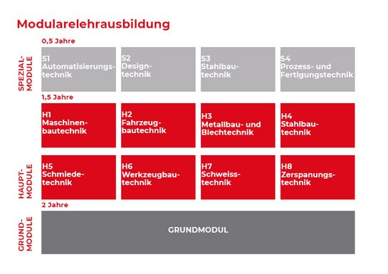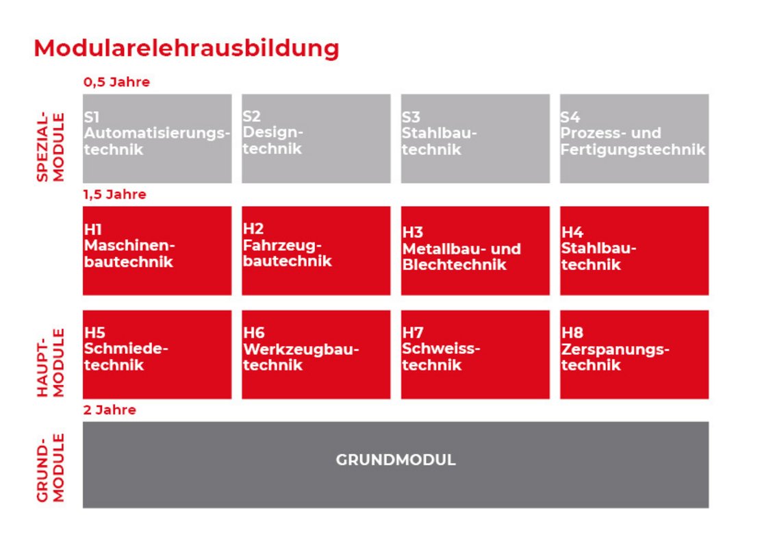 Weil jeder junge Mensch ganz spezielle Fähigkeiten und Interessen hat, sind die Lehrberufe in der Metalltechnik nach einem Modul-System aufgebaut. Jeder Lehrling wird im Grundmodul und zumindest in einem Hauptmodul ausgebildet (Lehrzeit 3,5 Jahre). Zusätzlich kann ein Spezialmodul oder ein weiteres Hauptmodul gewählt werden (Lehrzeit 4 Jahre). Im Lehrvertrag wird zu Beginn der Lehre festgelegt, in welchen Modulen der Lehrling ausgebildet wird.