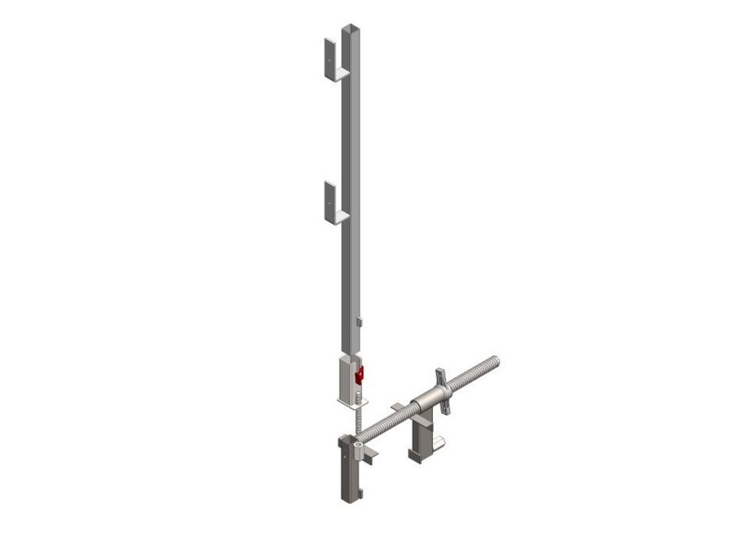 Mit dem Geländersteher sowie der Gerüstkonsole findet das Seitenschutzgitter doppelte Verwendung während des Schalungsprozesses. Es dient sowohl als Absturzssicherung auf der Gerüstkonsole als auch an der Gegenschalung. Zusätzlich kann das Geländer beim Betonieren um 15° nach hinten geklappt werden.