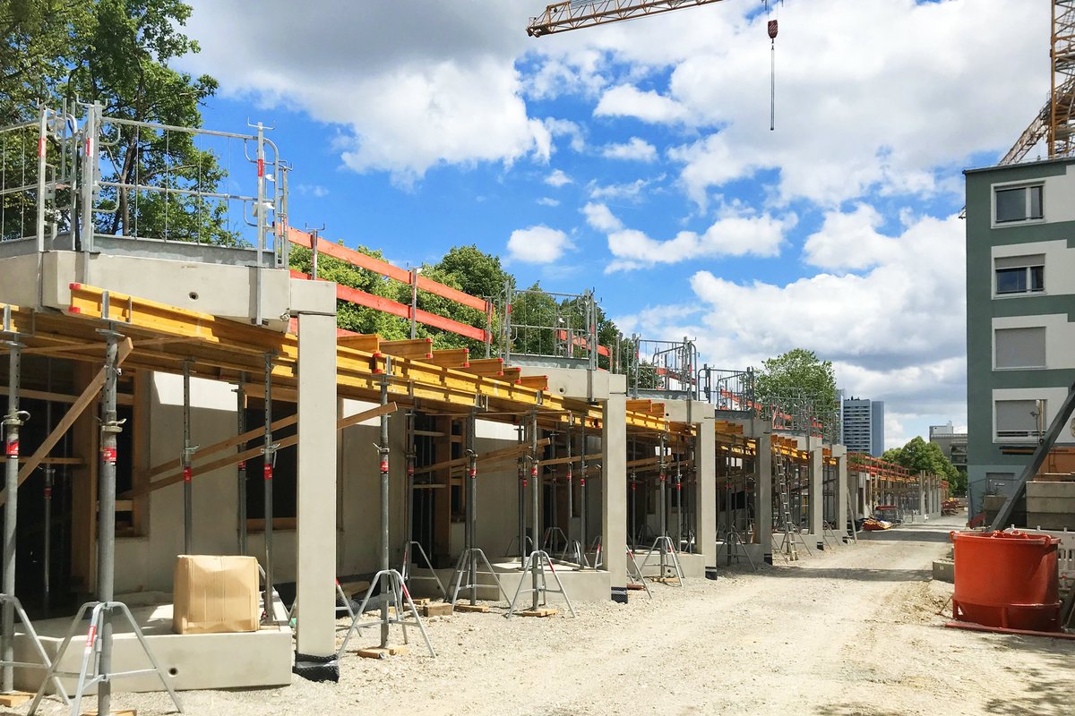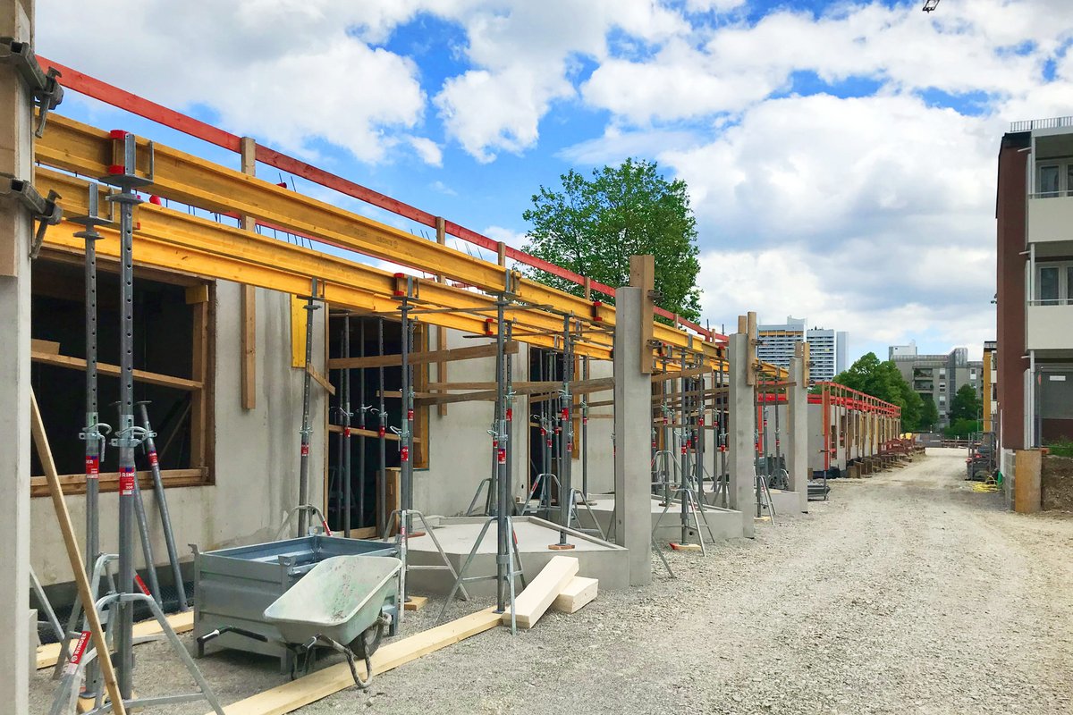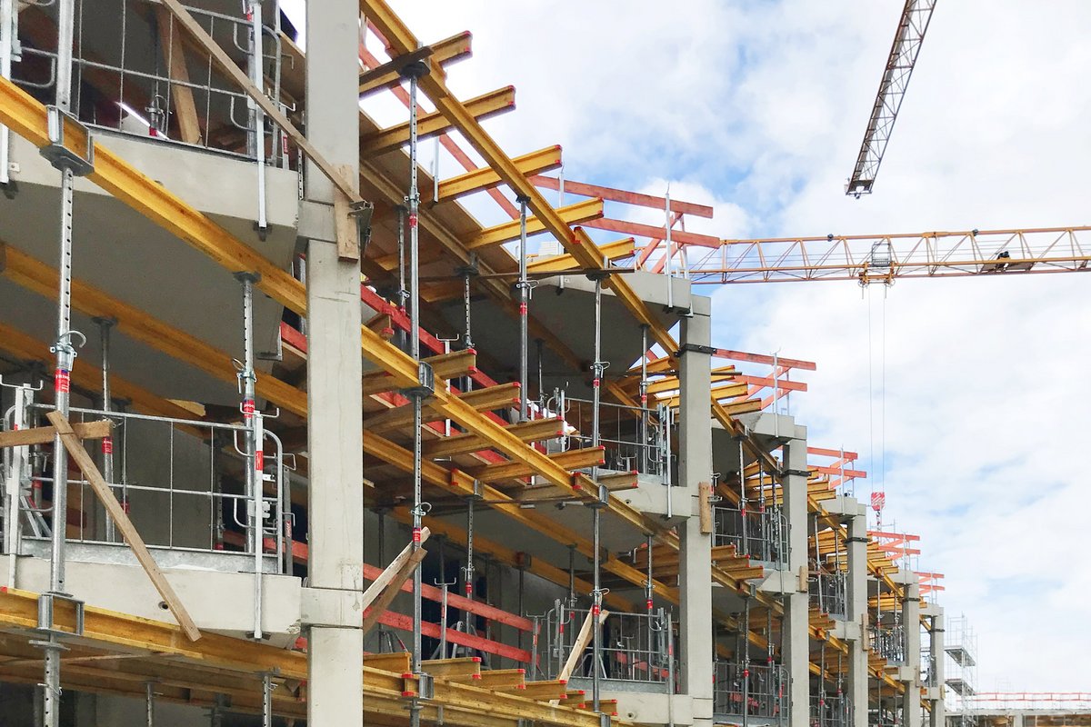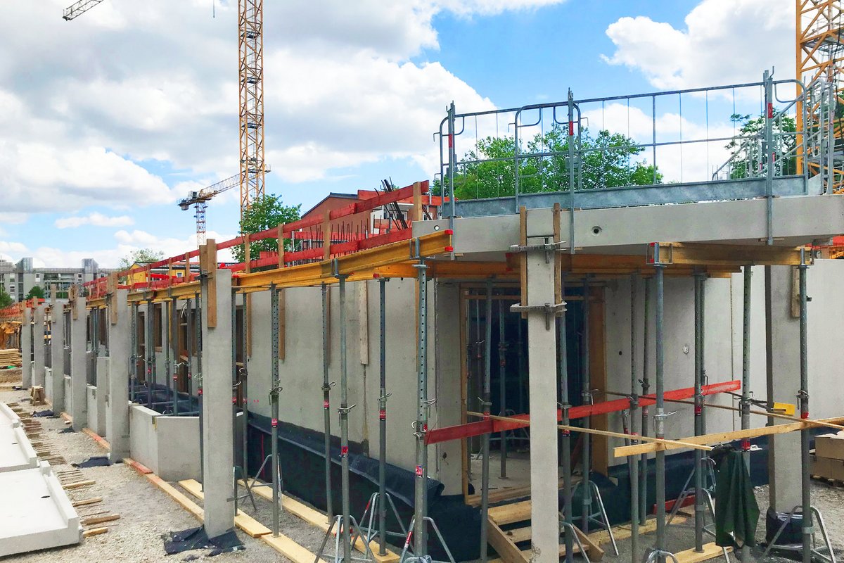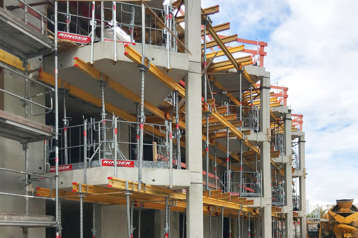 Beim Bau kamen Fertigteile in Kombination mit H20-Trägern zum Einsatz. Zur Abstützung der Konstruktion wurden RINGER Deckenstützen verwendet. Ergänzend dazu sorgten Seitenschutzgitter für die nötige Sicherheit der Arbeiter während der gesamten Bauphase.