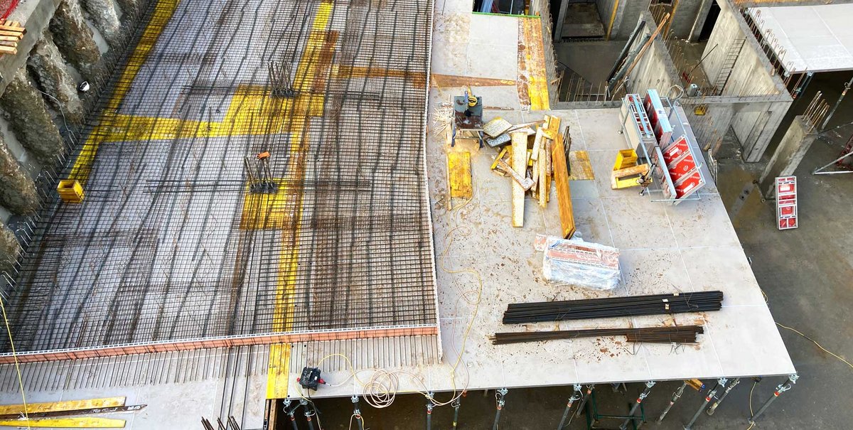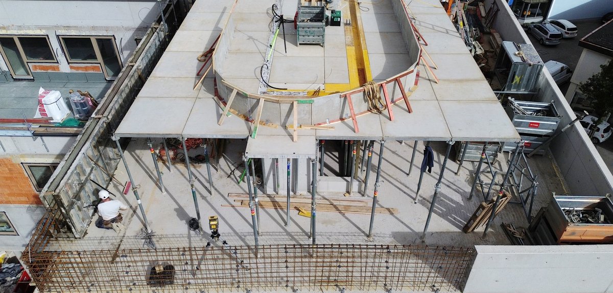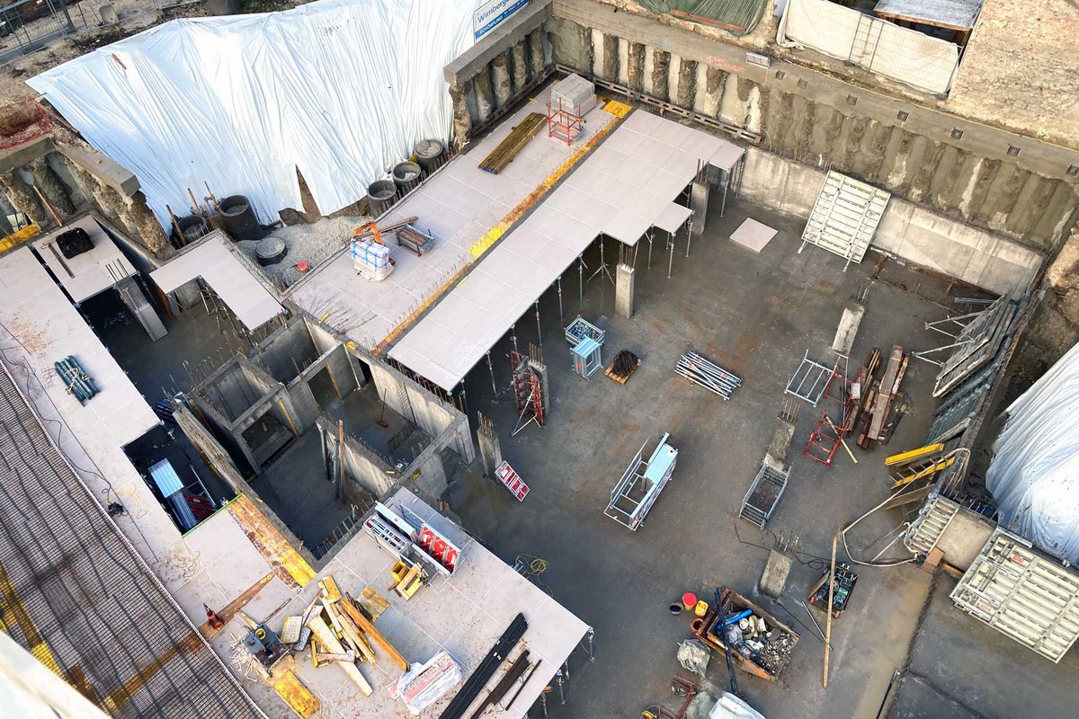 Aufgrund der speziellen Form des Grundstücks, die einen verwinkelten Grundriss nach sich zog, wurde für die anspruchsvollen Deckenschalungsarbeiten die handliche und hochflexible AluDEK Moduldeckenschalung eingesetzt. Die geschickte Kombination aus großformatigen Schalungselementen (135x135cm) und kleineren Modulen (90x135cm) ermöglichte es, die Passbereiche in der Baugrube auf lediglich 12% zu reduzieren. Zum Ausgleich der Restflächen kamen AluDEK Auflageschienen zum Einsatz, die mit maßgeschneiderten Schalungsplatten belegt wurden.